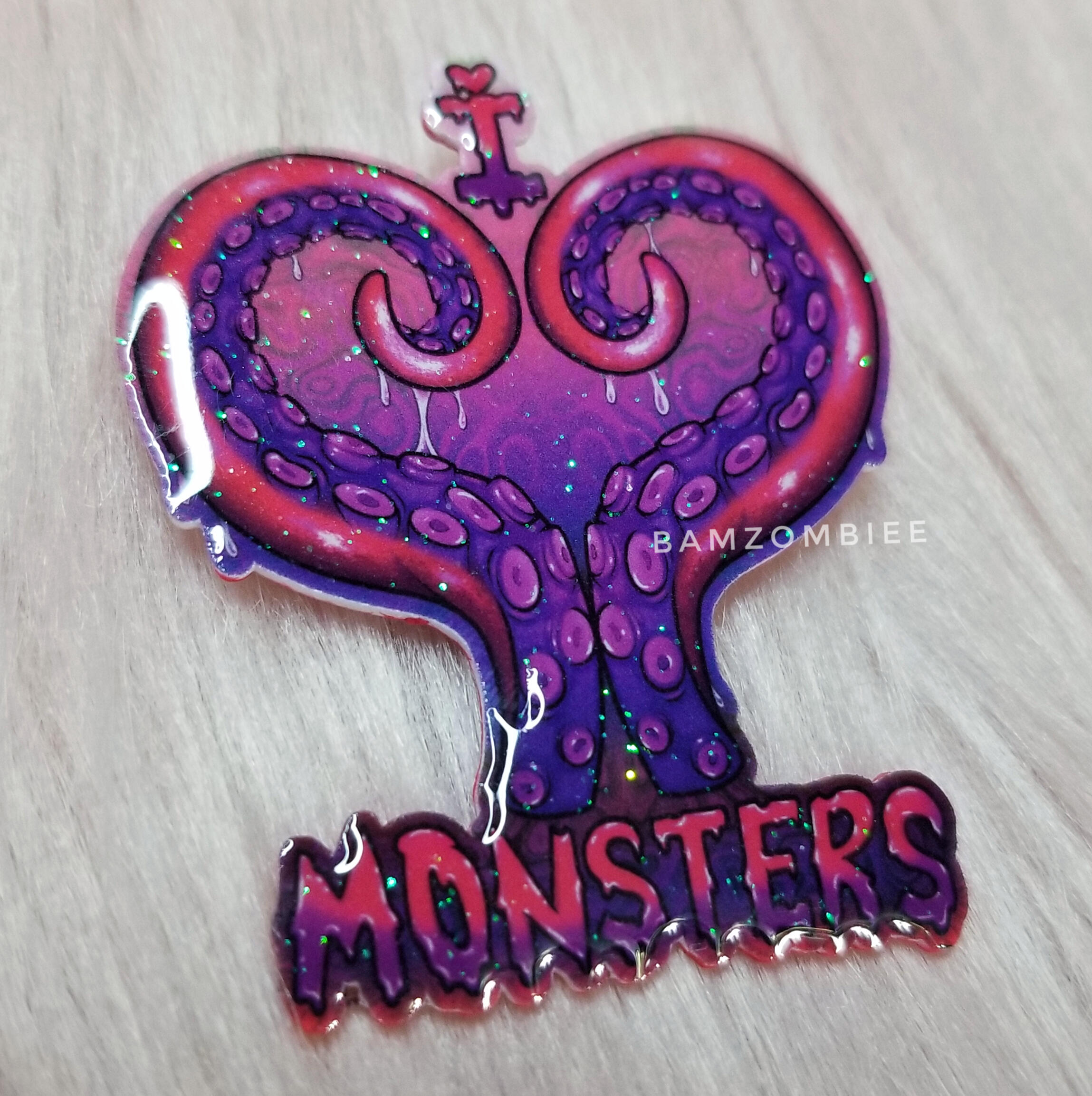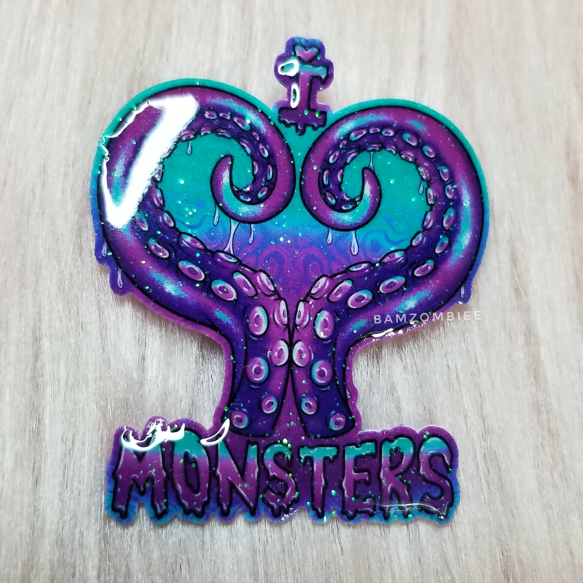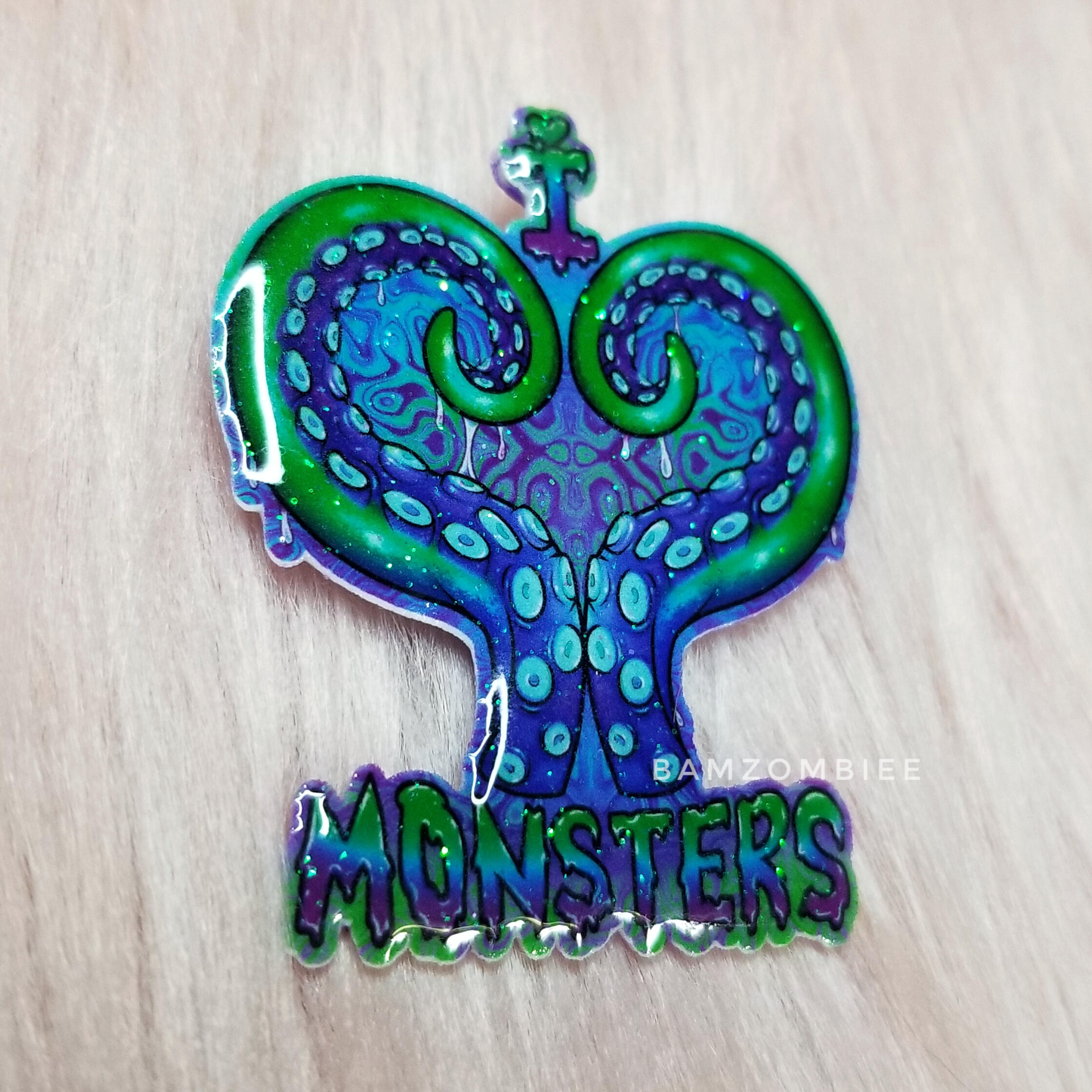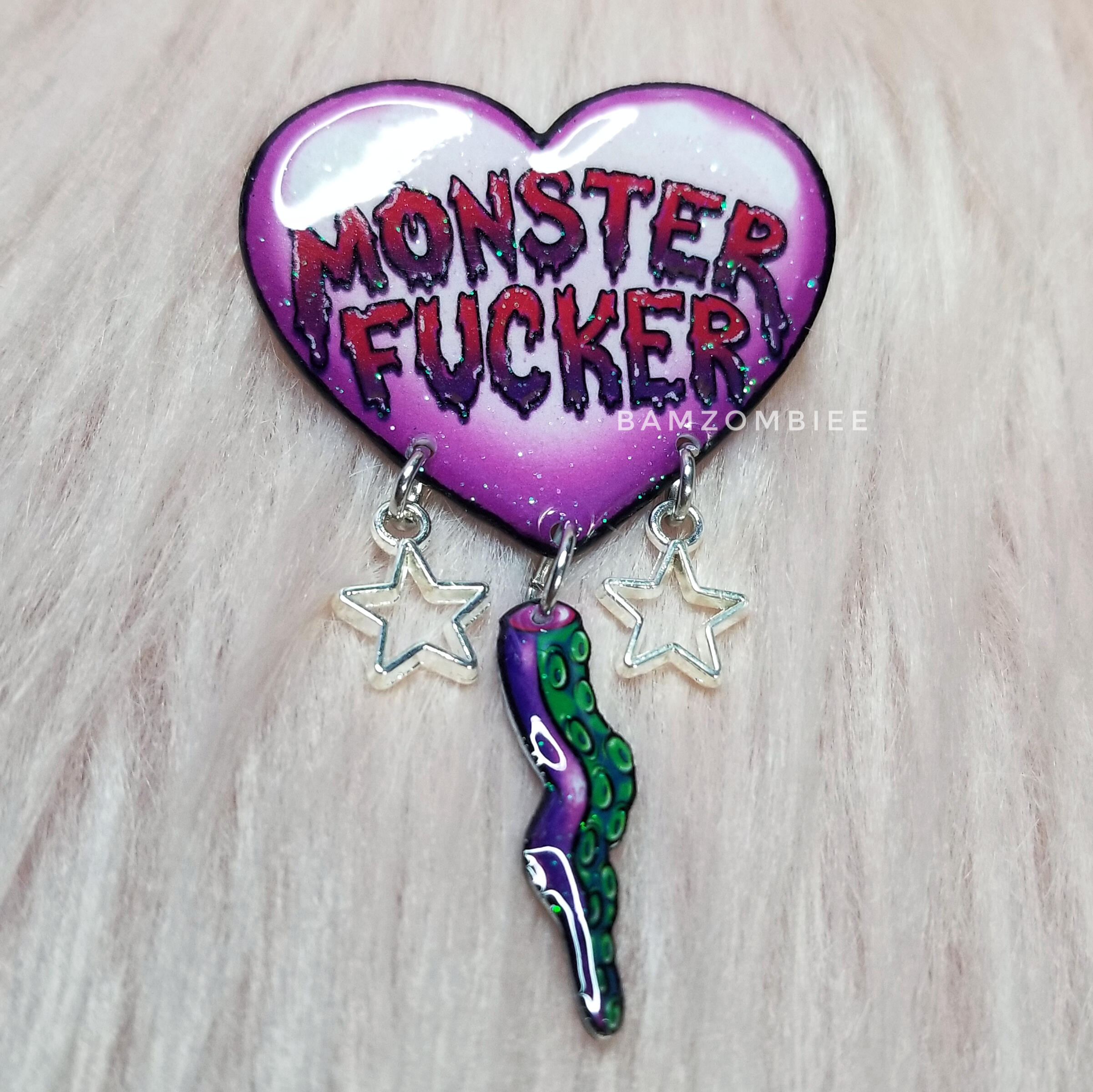 this pin features my original artwork printed on shrink plastic and coated with glitter and resin. it is adorned with a shrink plastic tentacle and star charms. it has a safety-pin style back.