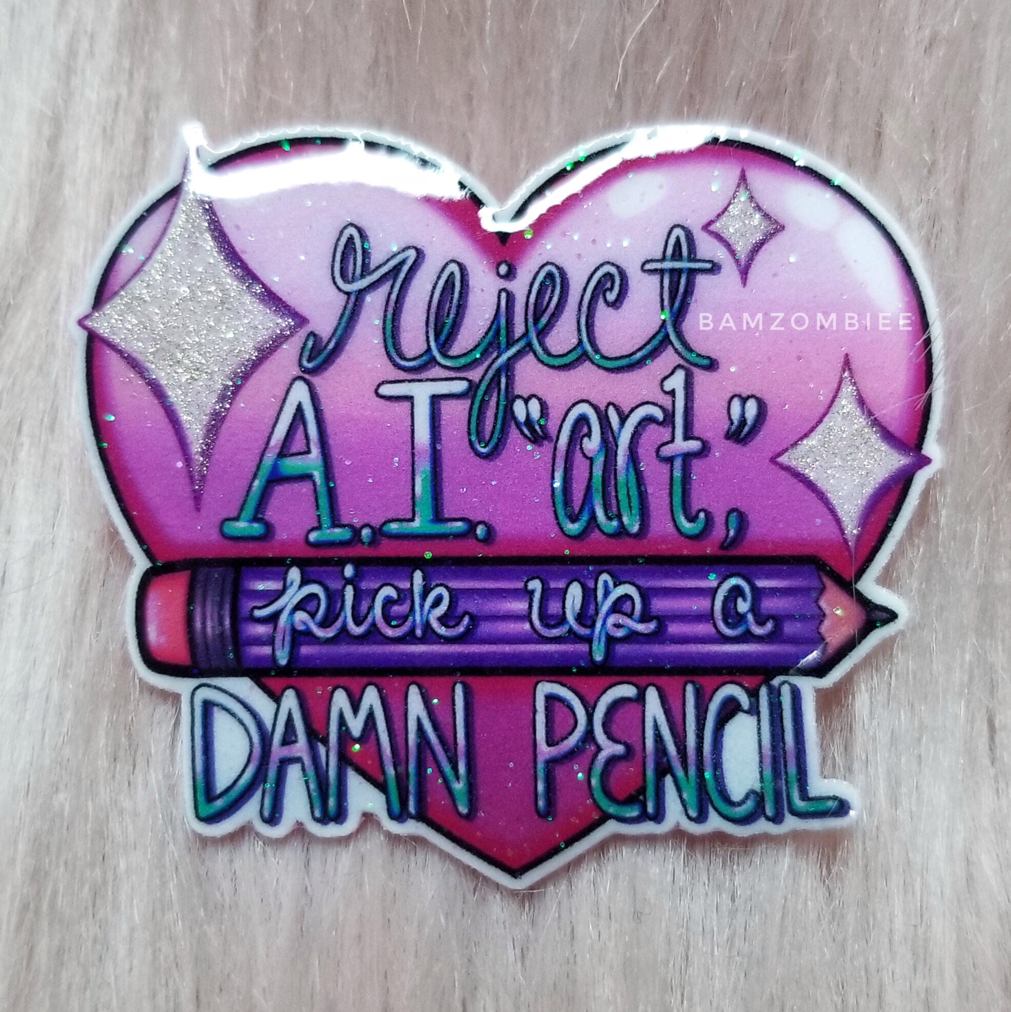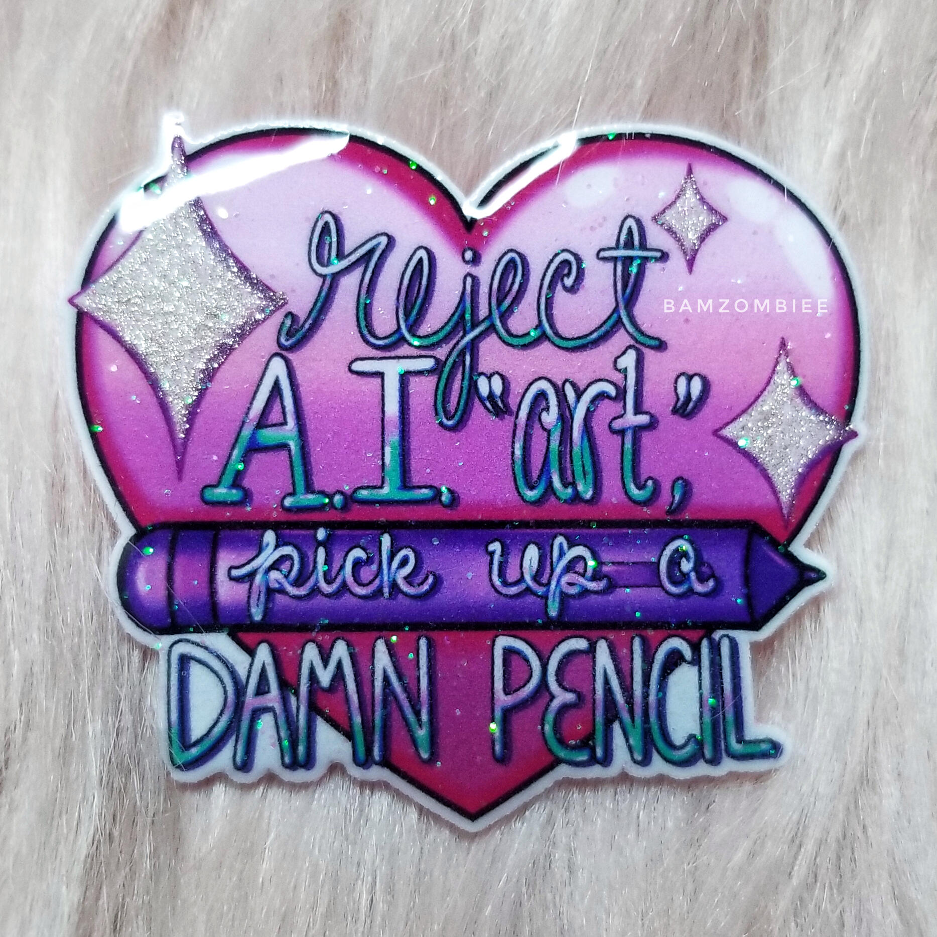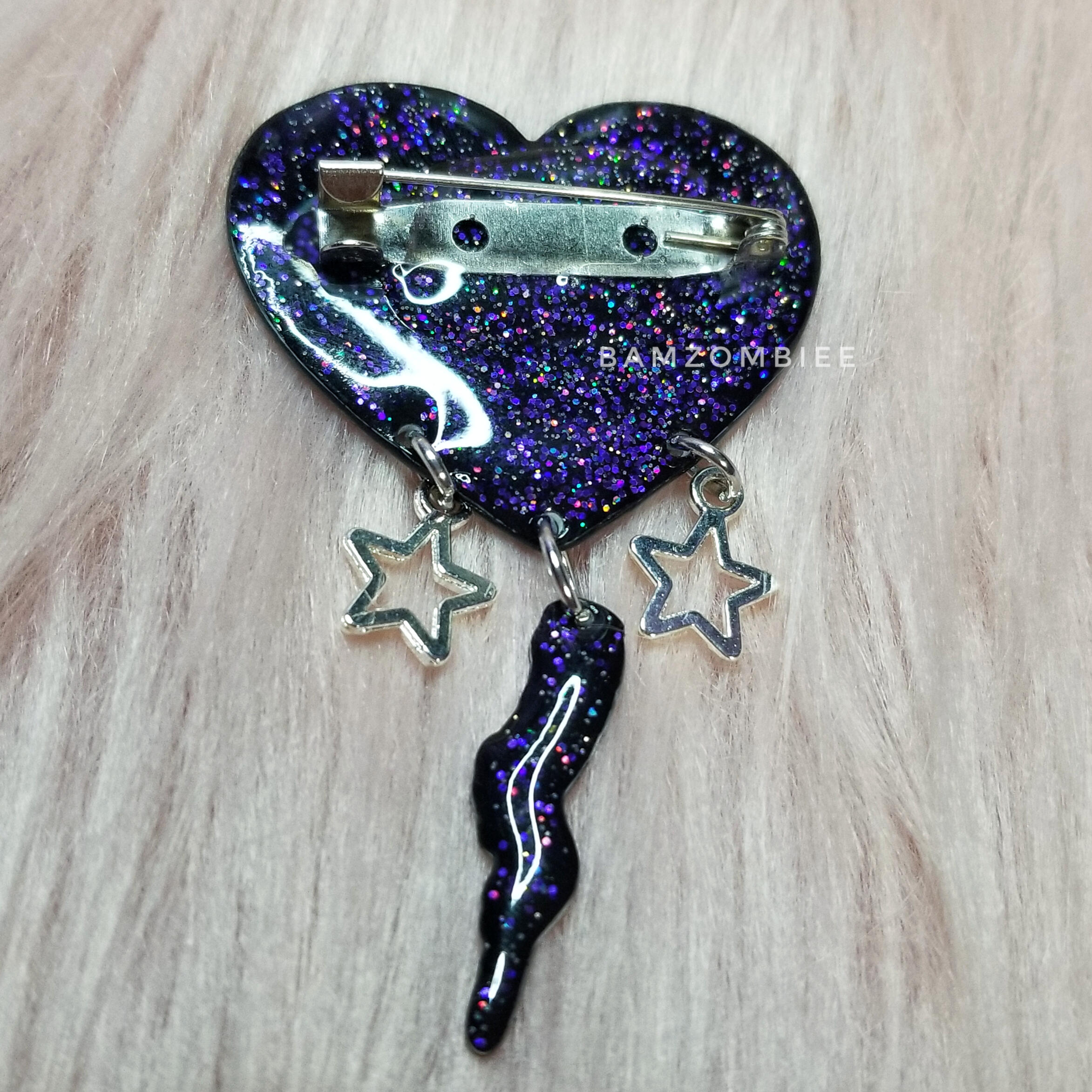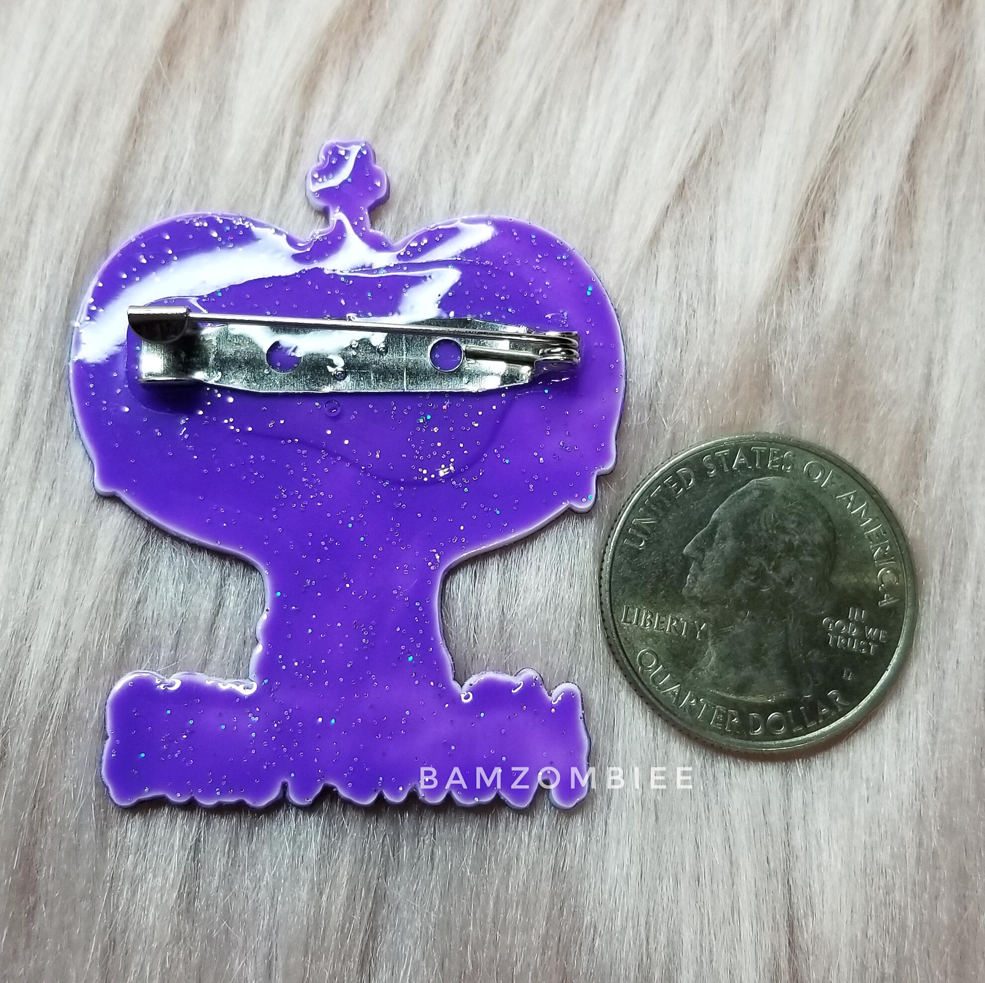 this pin features my original artwork printed on shrink plastic and coated with glitter and resin. it has a safety-pin style back.