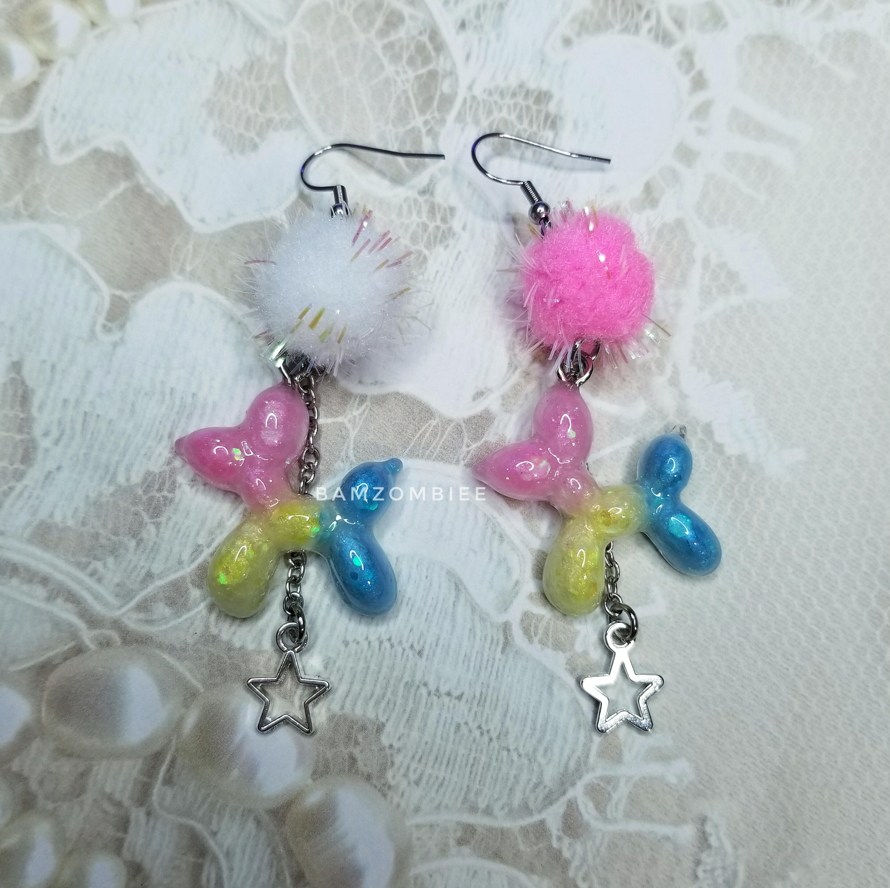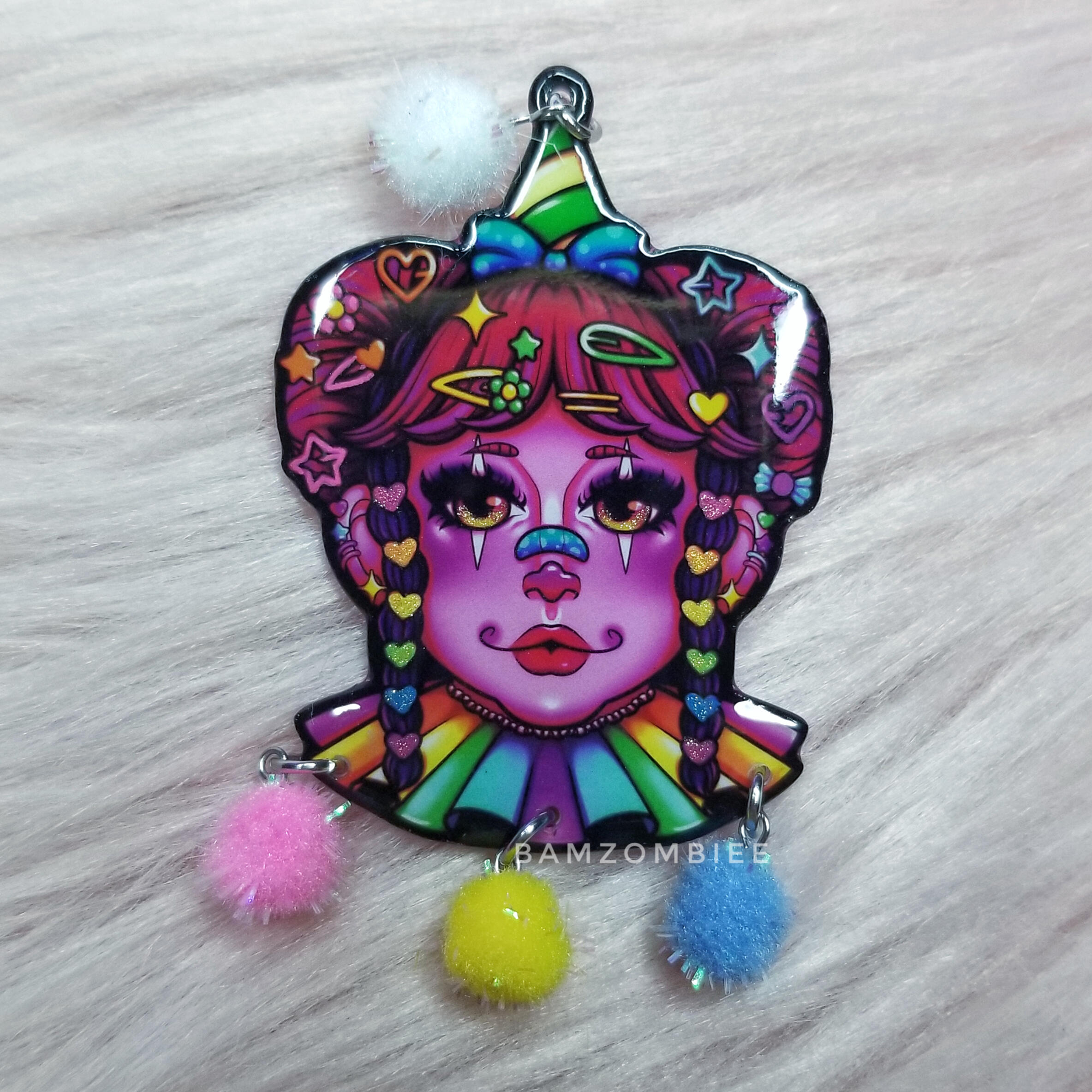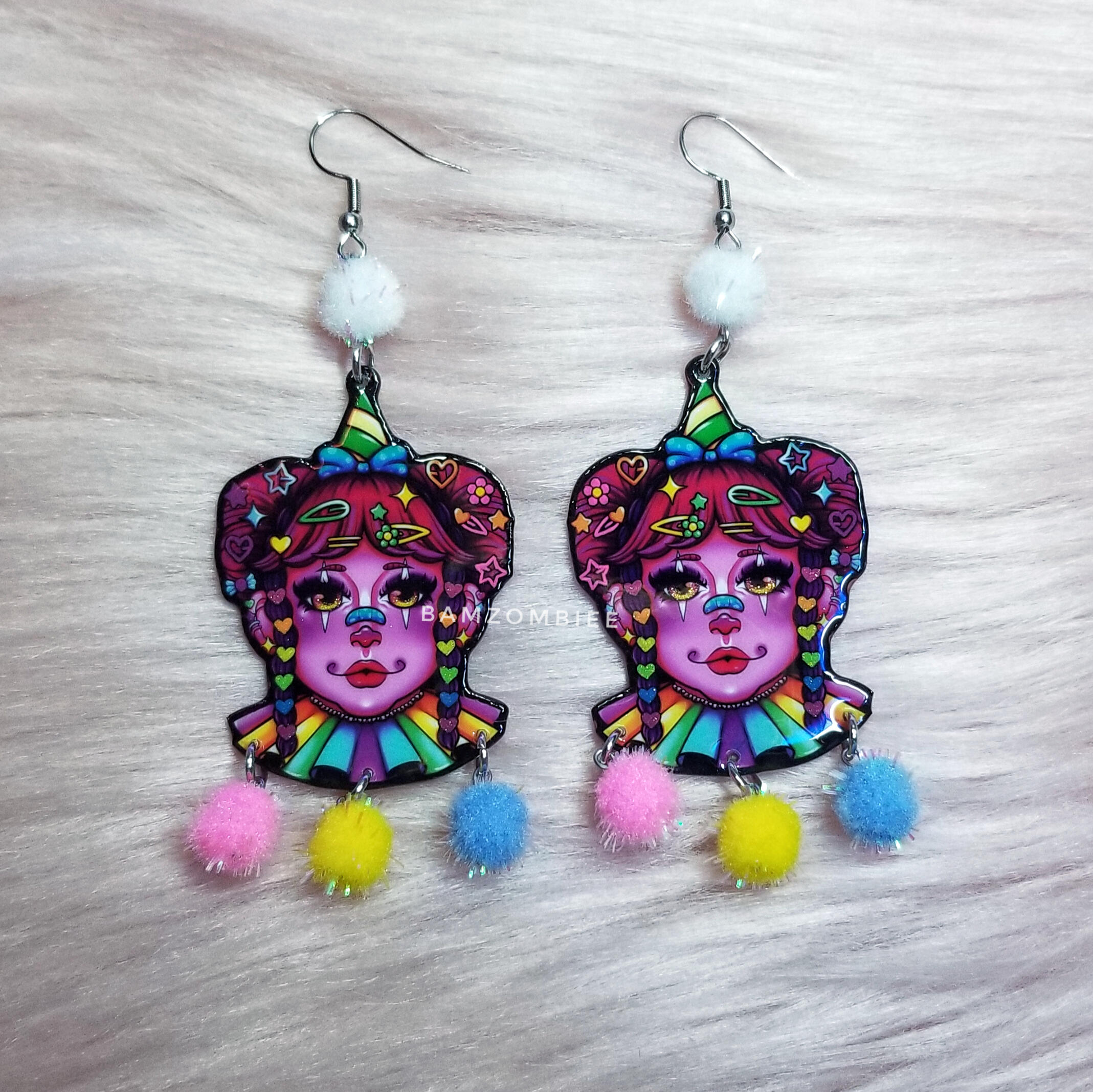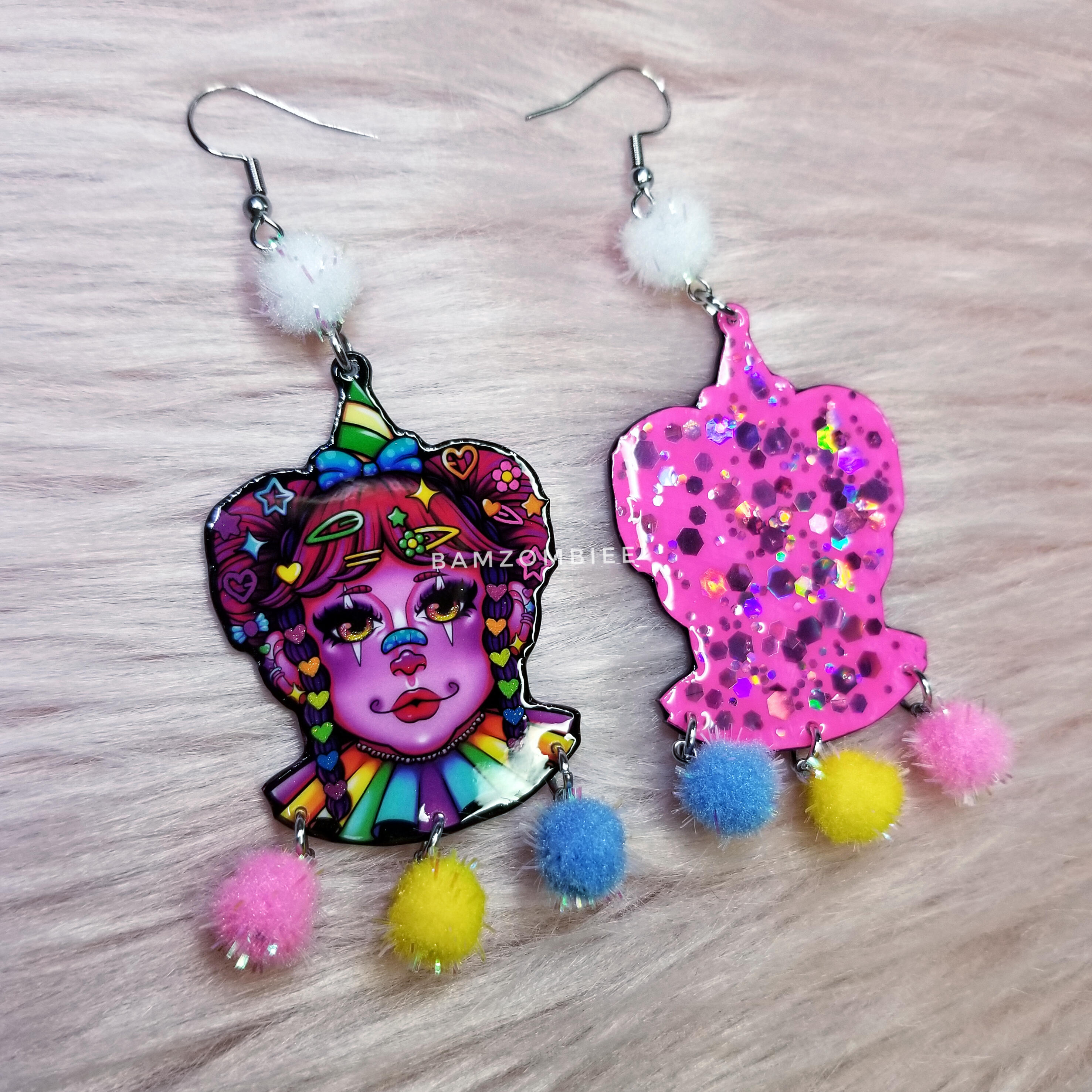these earrings feature my original artwork printed on shrink plastic and coated with glitter and resin. they are decorated with multicolored pom poms.