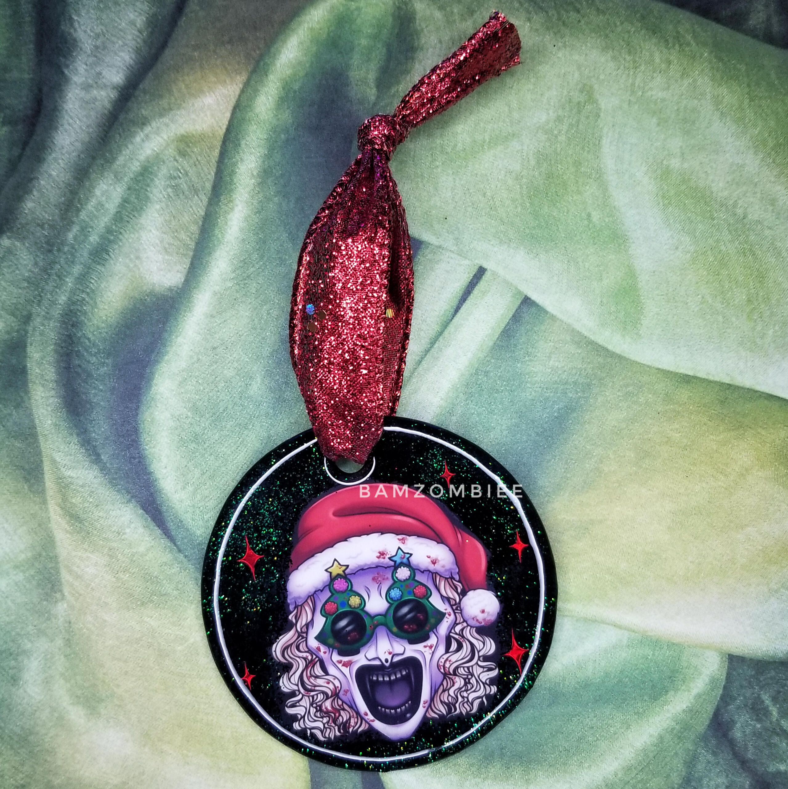 x2 in stock & ready to ship; quantities past that will be made to orderthis ornament features my original terrifier 3 fanart, printed and adhered to a wood circle, and coated with glitter & resin.