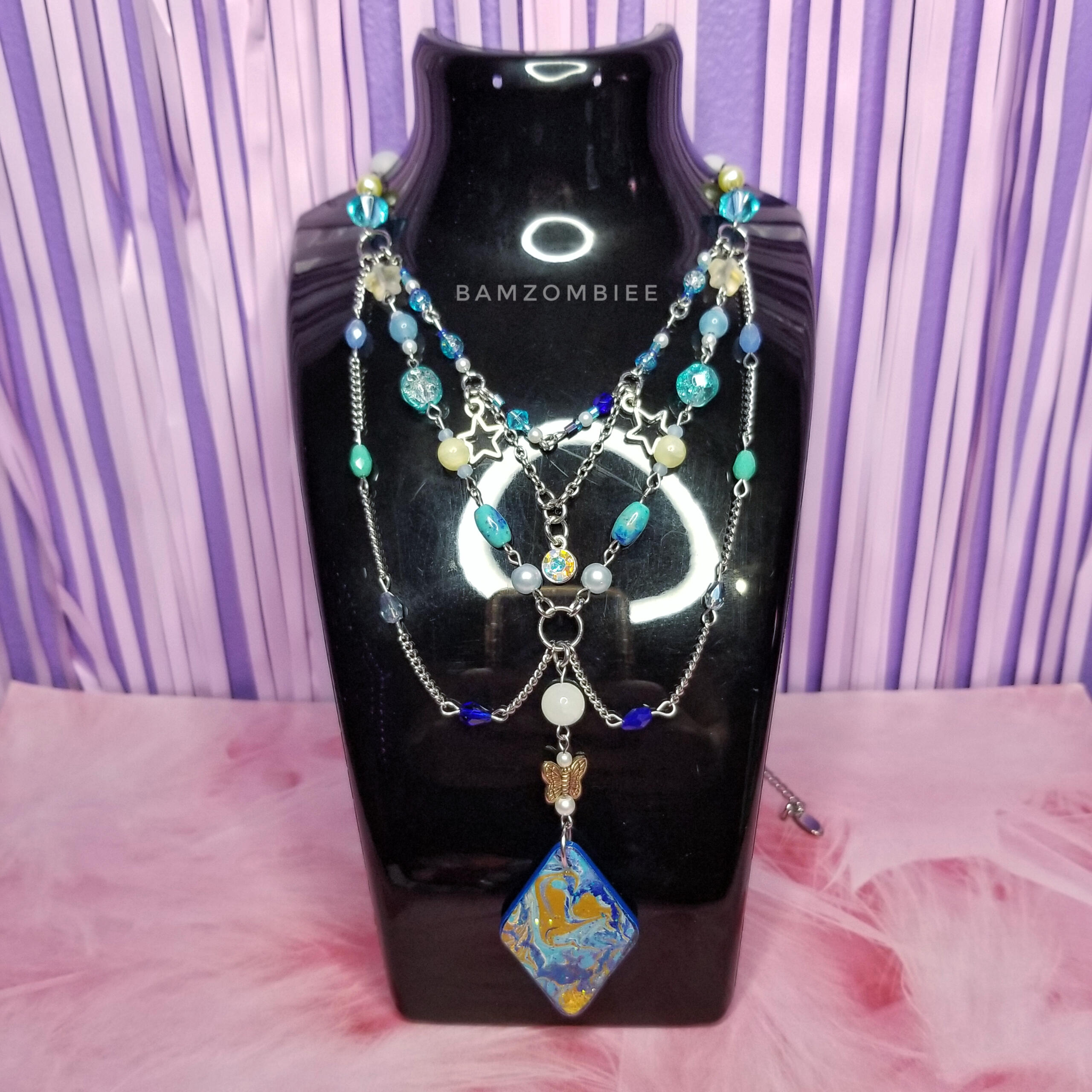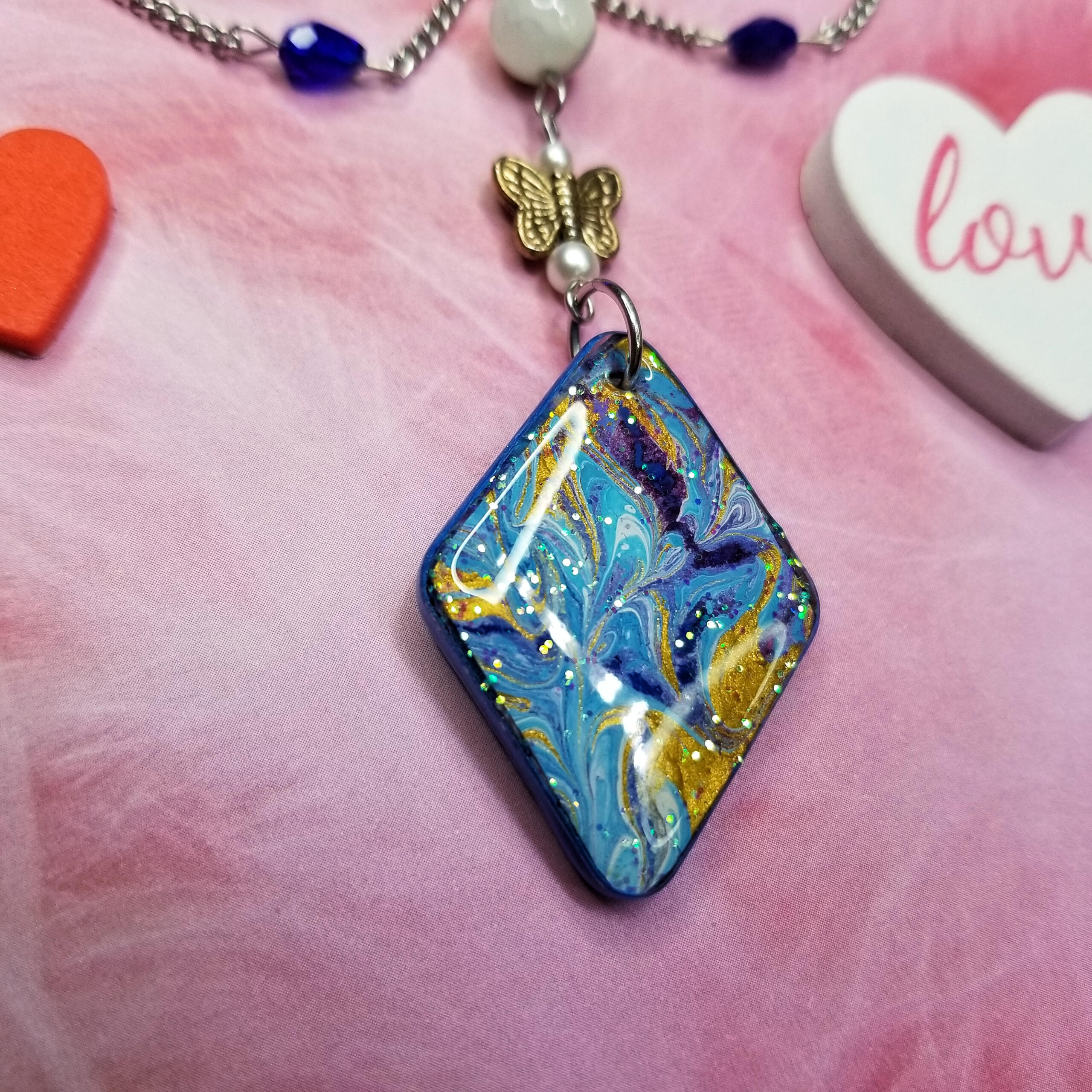 this necklace features a reversible handcrafted charm with marbled paint on both sides, and is accompanied by dreamy beaded details in teal, blue, gold, and silver.