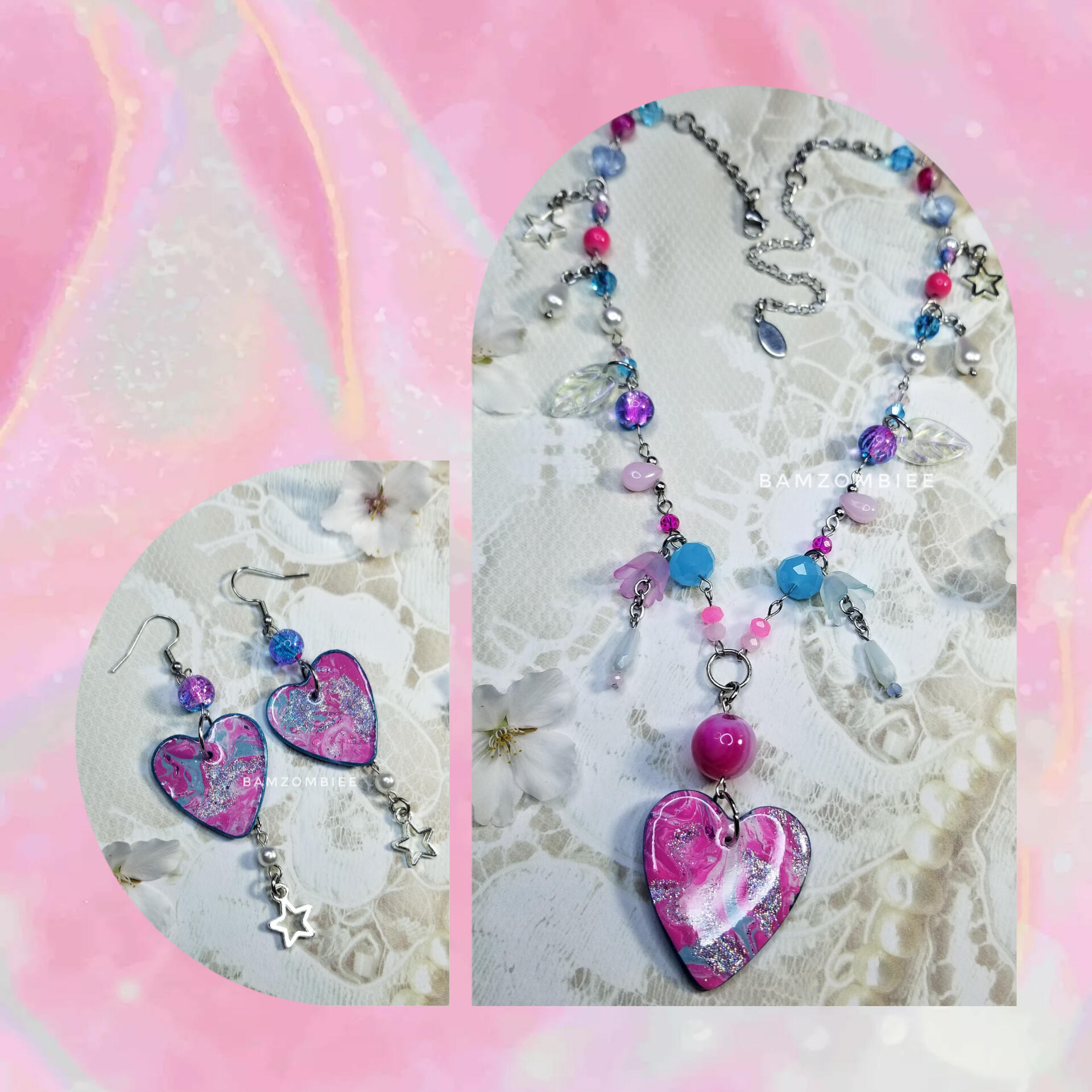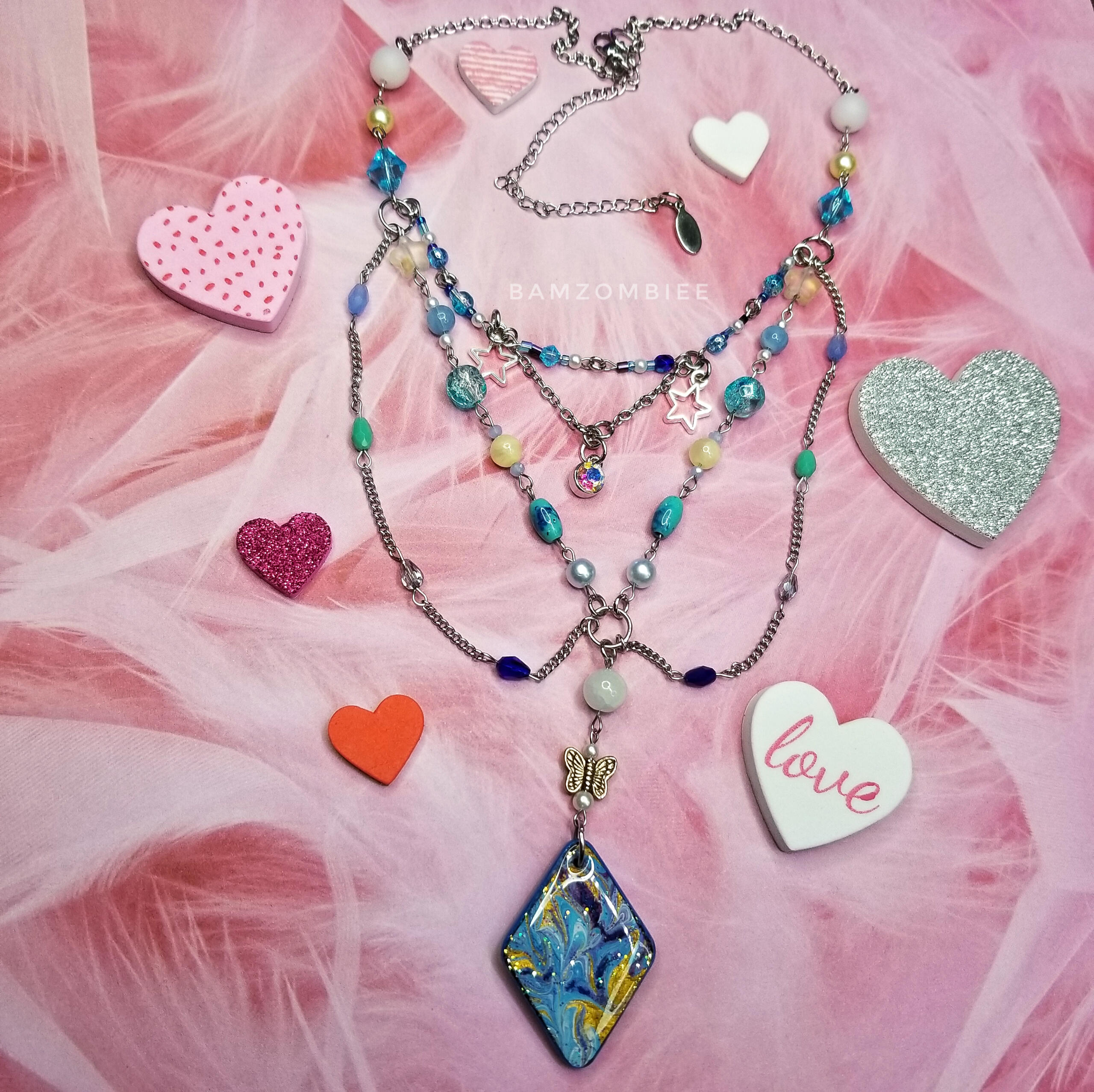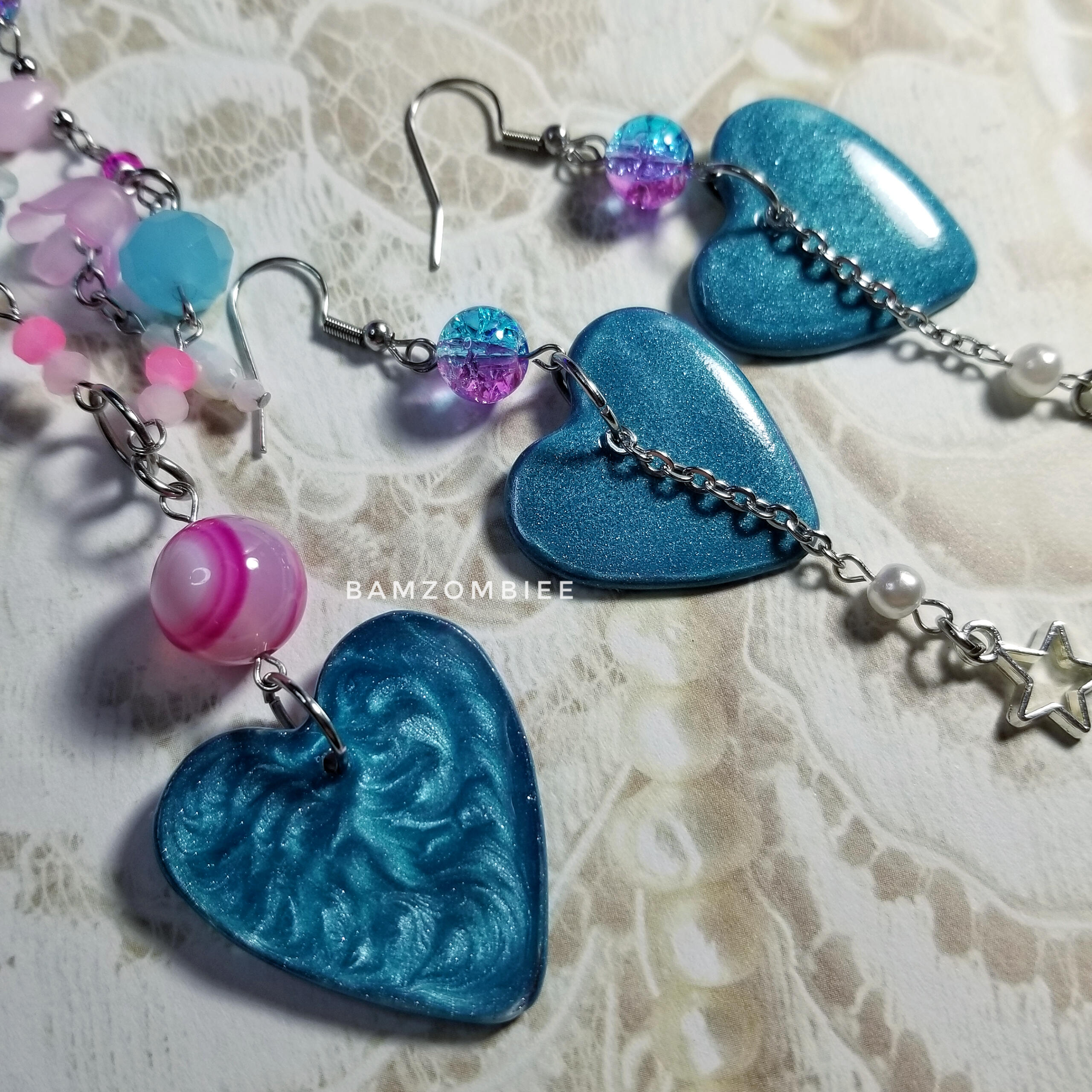 MATERIALS: the charms are made from acrylic paint skins and UV resin, all of the metals are stainless steel, and the beads are made from glass, plastic, and stone.