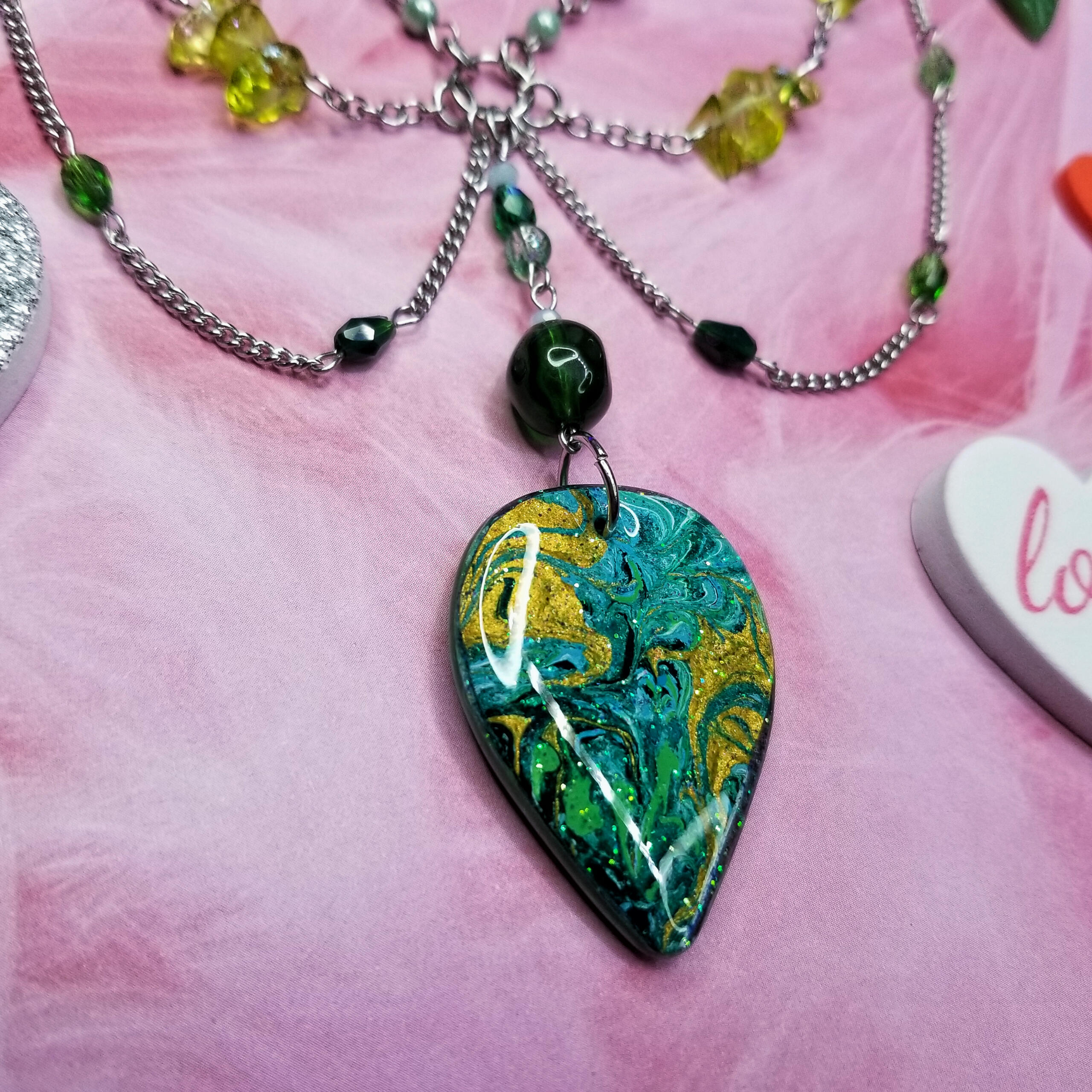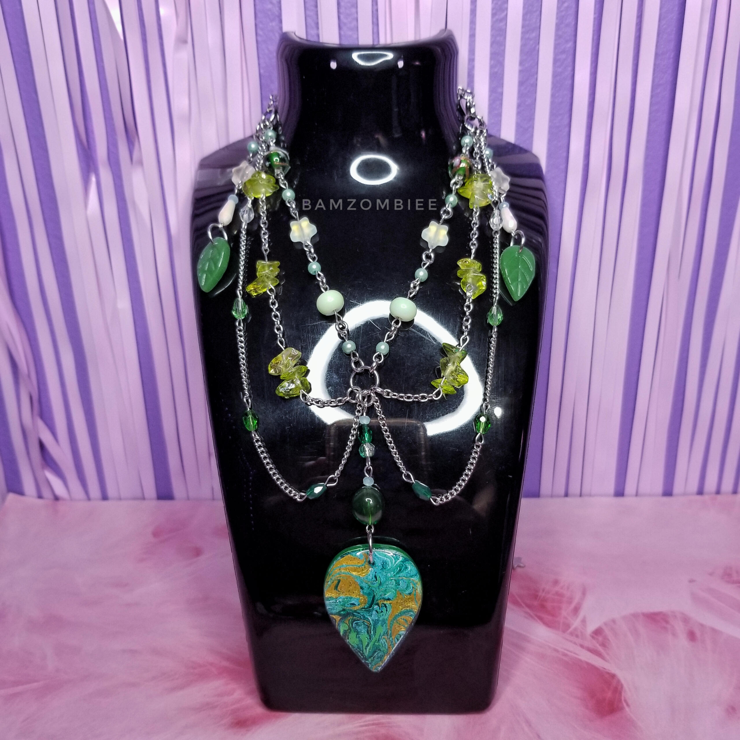 this necklace features a reversible handcrafted charm with marbled paint on both sides, and is accompanied by earthy beaded green & gold details.