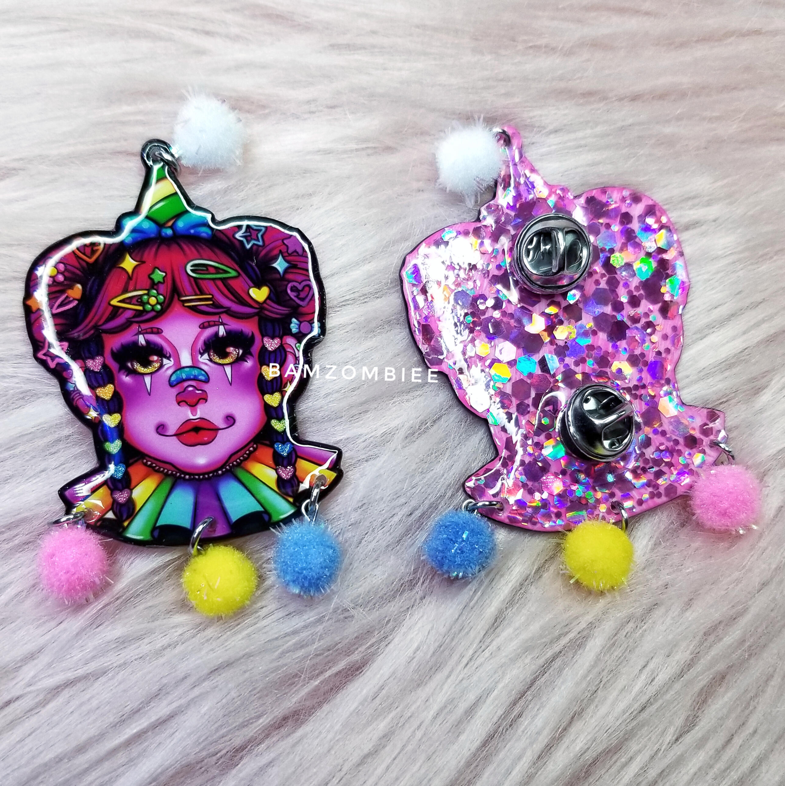 this pin features my original artwork printed on shrink plastic and coated with glitter and resin. it is decorated with multicolored pom poms. may have a safety pin-style back or 2 butterfly-style backs, sent at random.