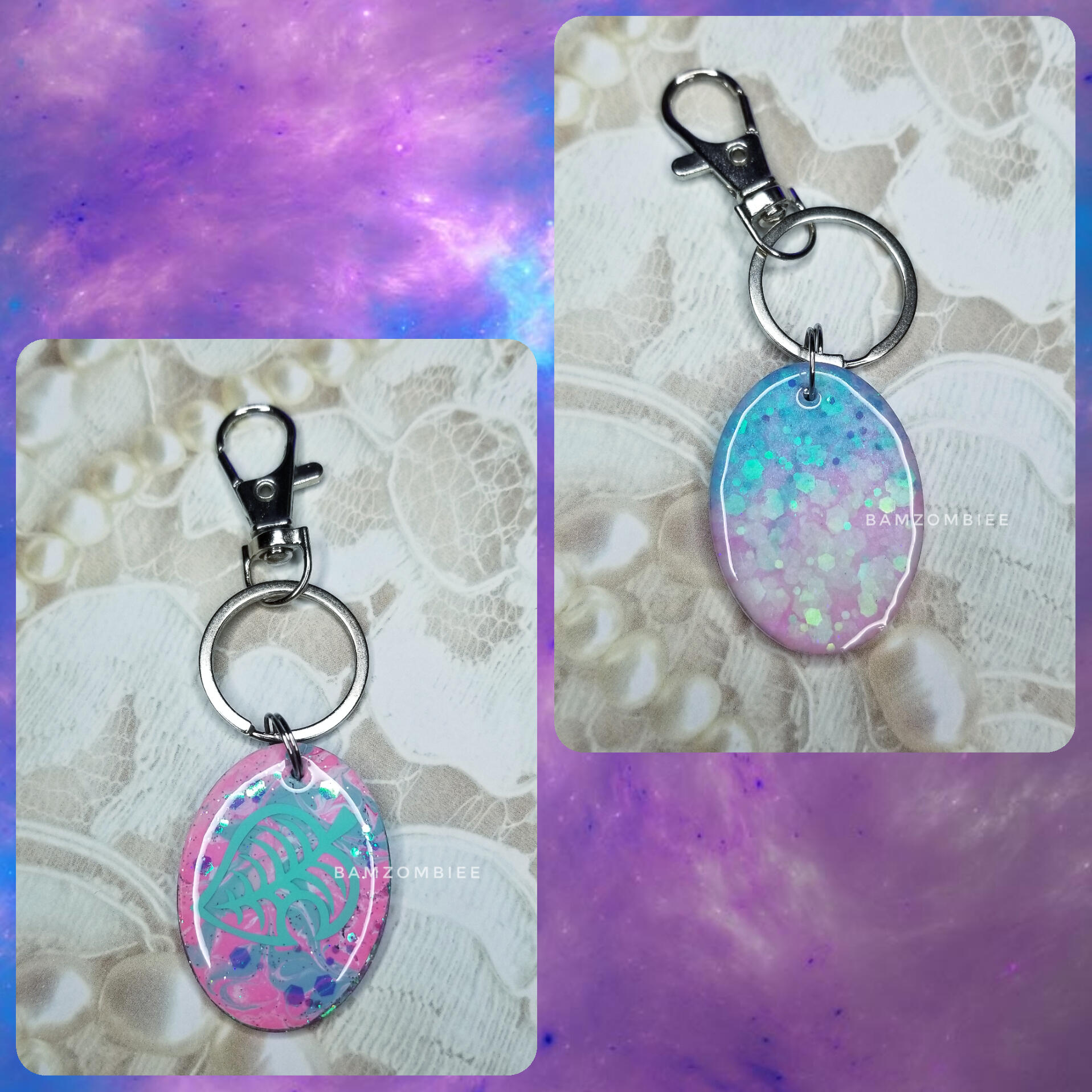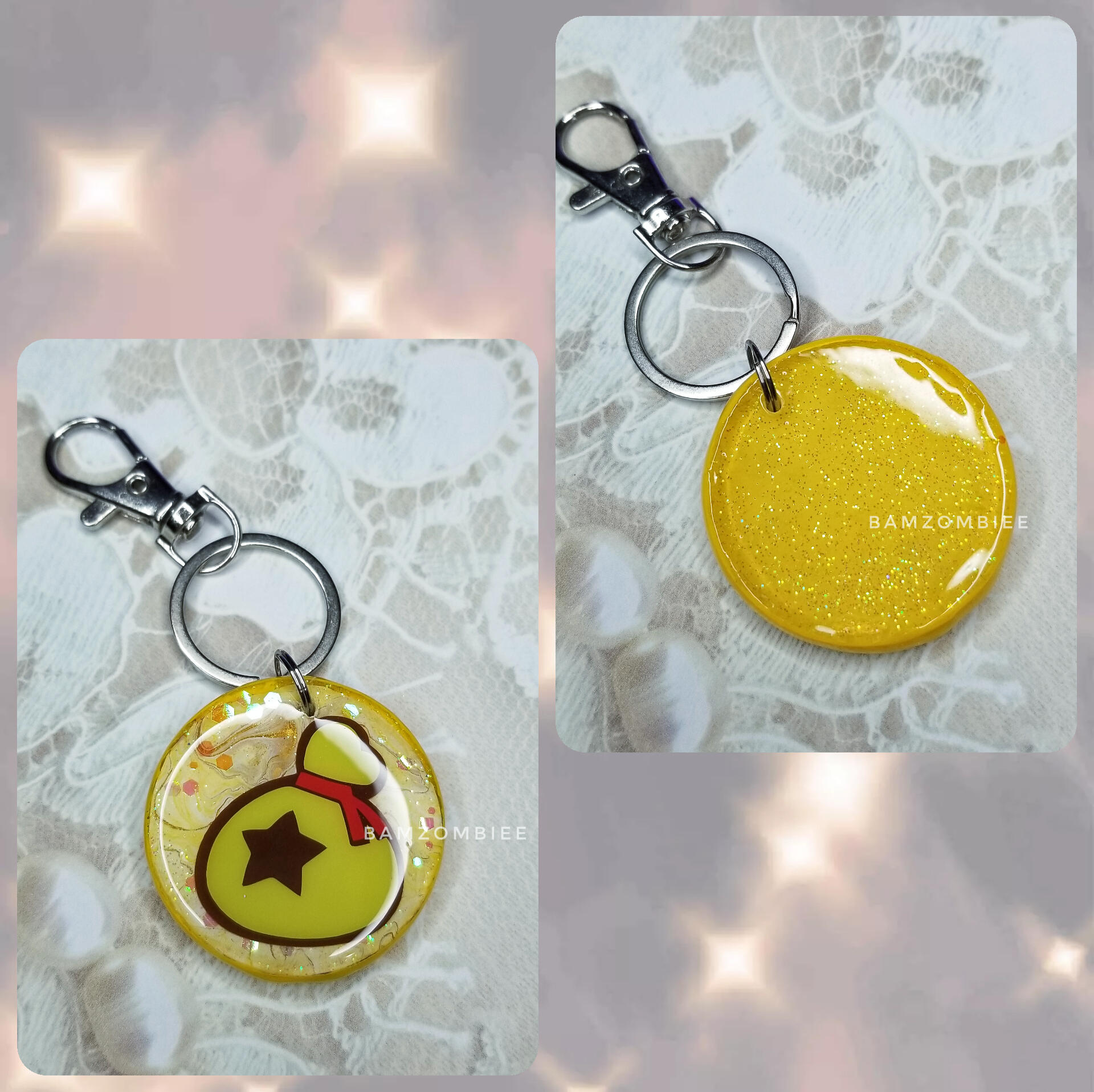 these keychains feature a paint-swirl background, along with various Animal Crossing themed vinyl decals. they are made out of UV resin.