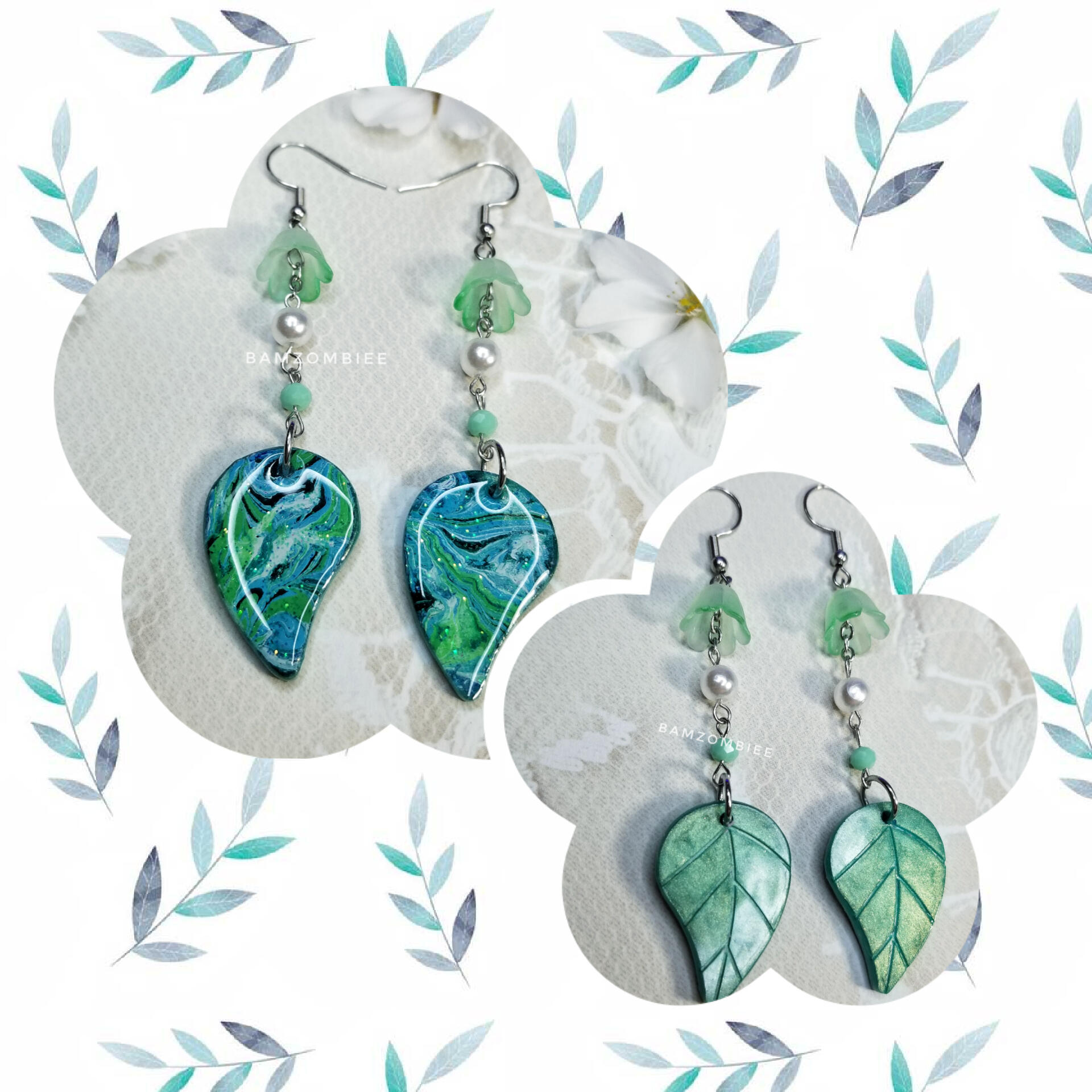 these earrings feature reversible leaf-shaped charms, and are dangling from flower-shaped beads.