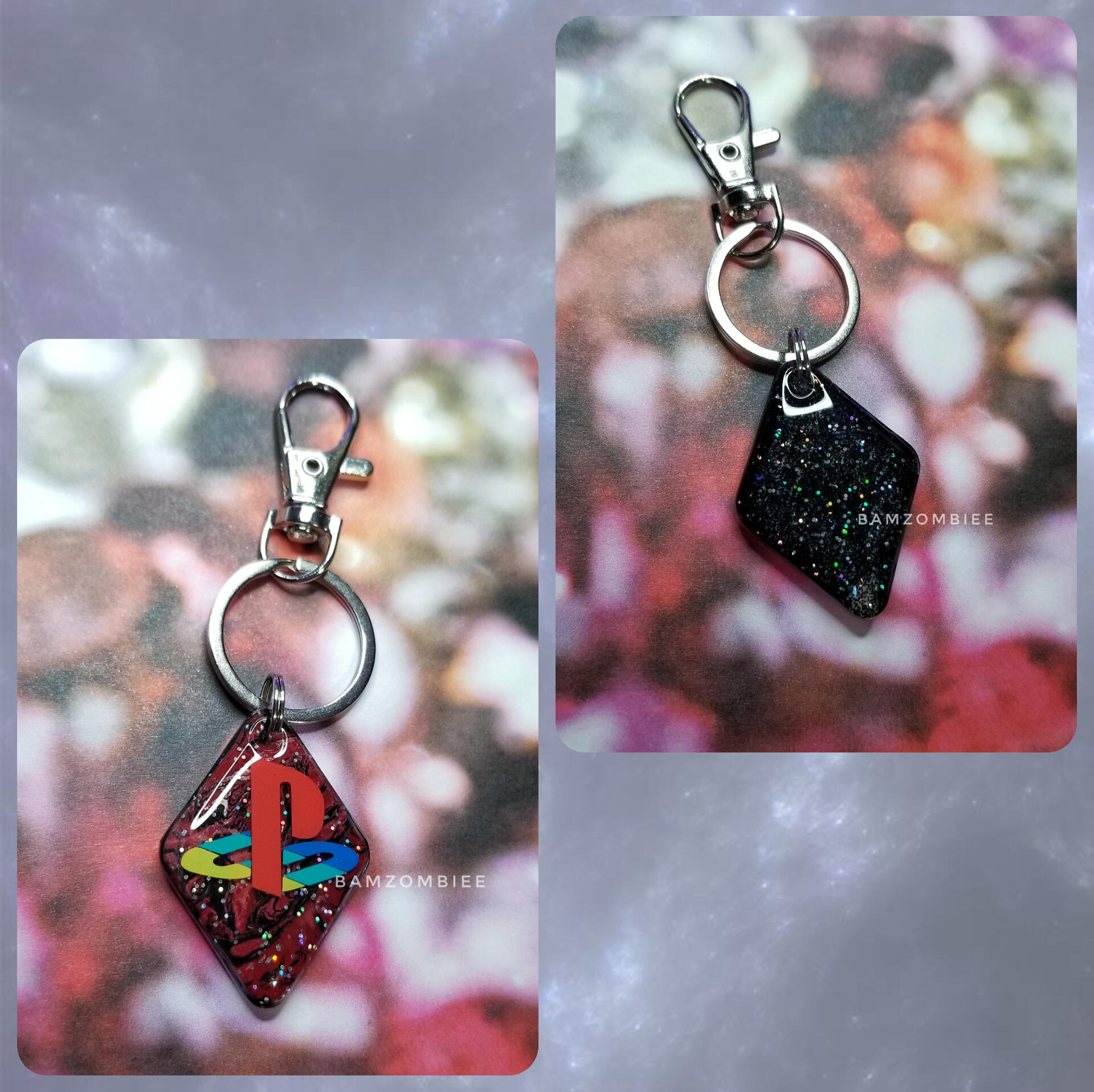 this keychain features a paint-swirl background, along with a PS1 logo cut out of vinyl. it is made out of UV resin.
