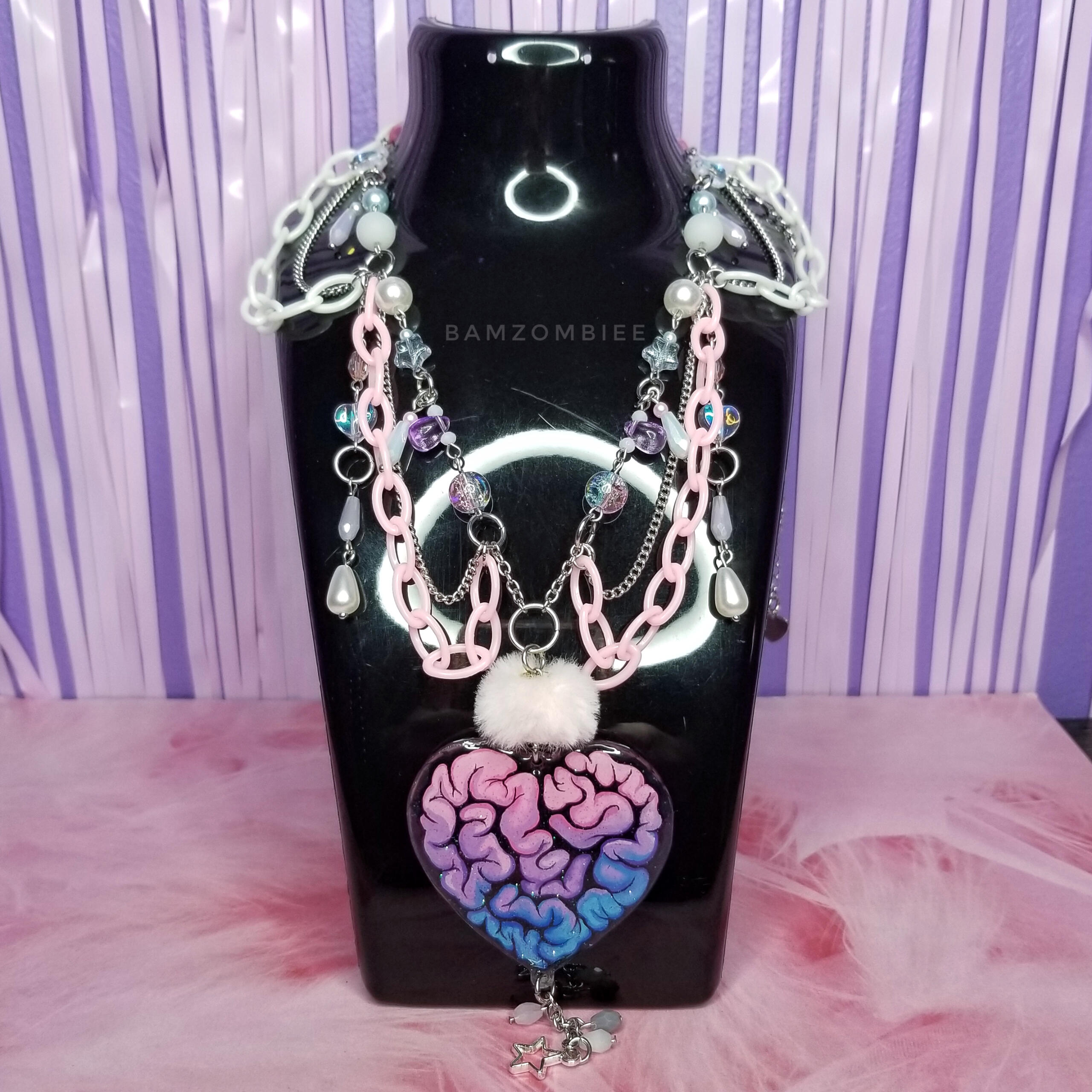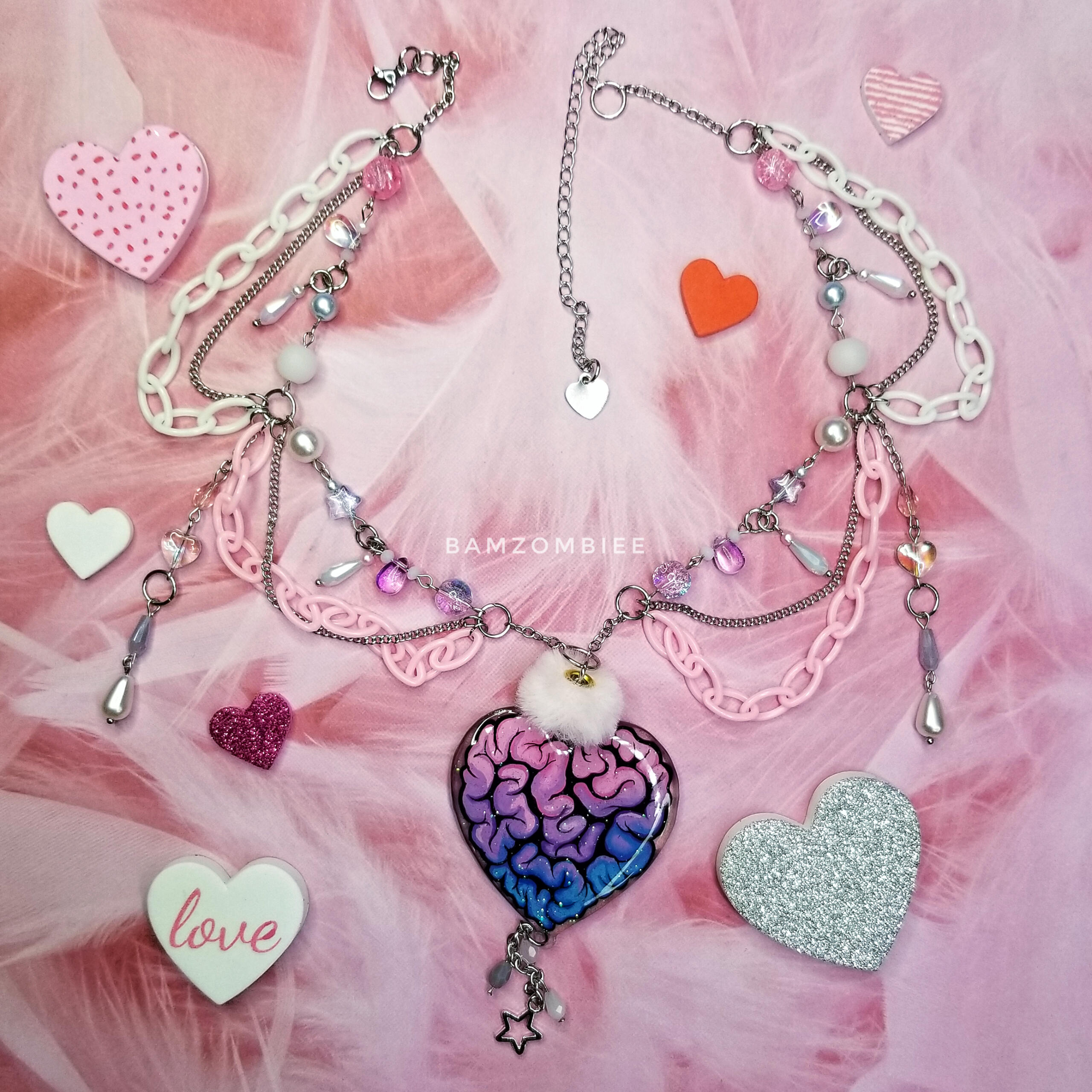 this necklace features a reversible hand-painted charm, depicting a heart-shaped lump of guts! how romantic. the charm is accompanied by colorful pastel beads and dangly chain details.