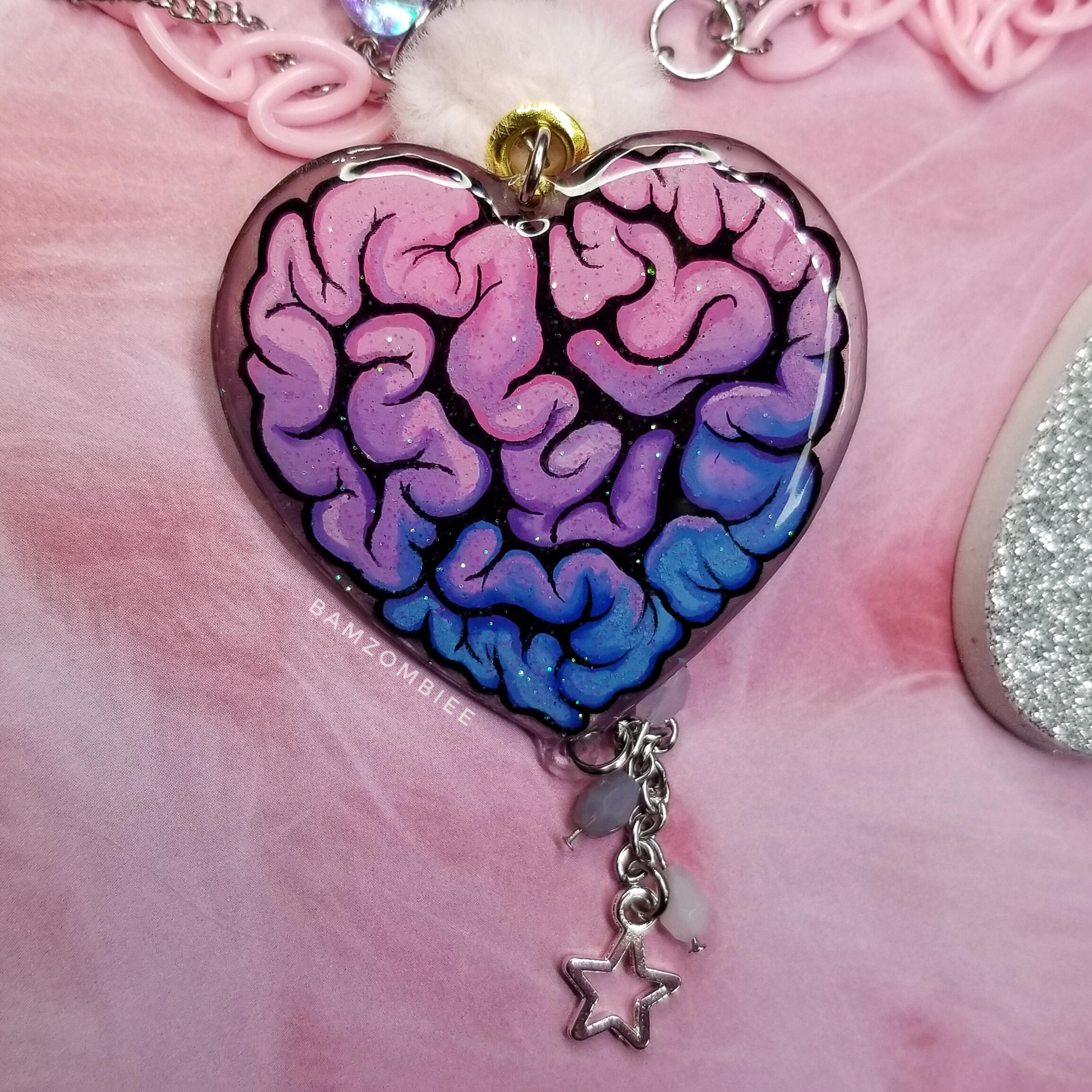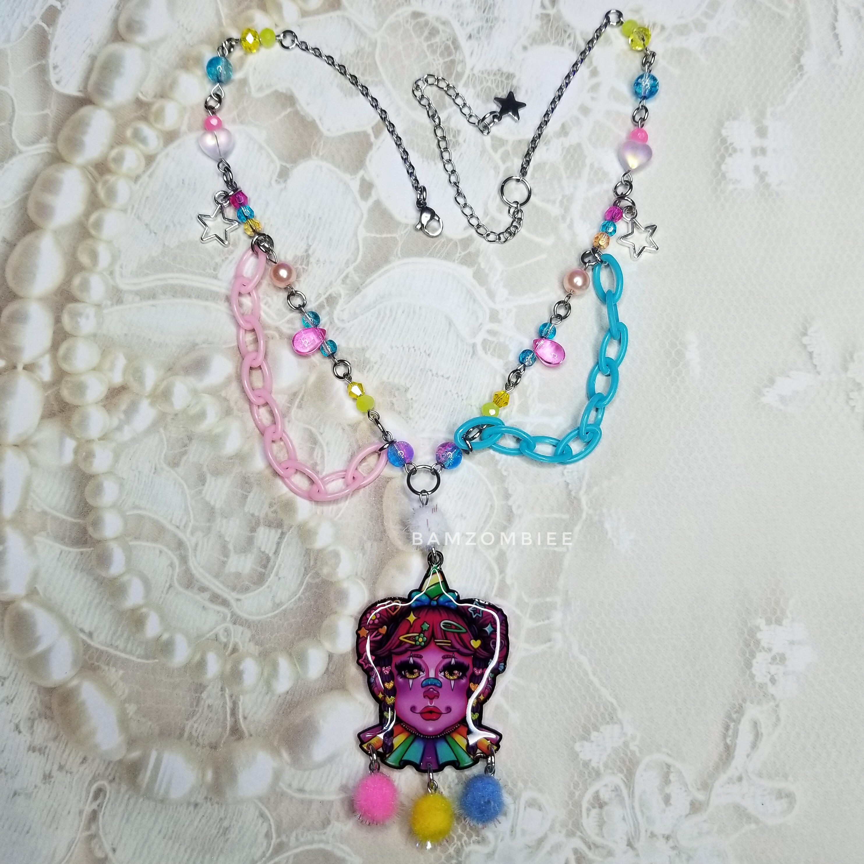 this necklace features my original artwork, printed on shrinky plastic, and coated in glitter & resin. the design is asymmetrical, detailed with dangly chains, pink & blue beads, and teeth charms.