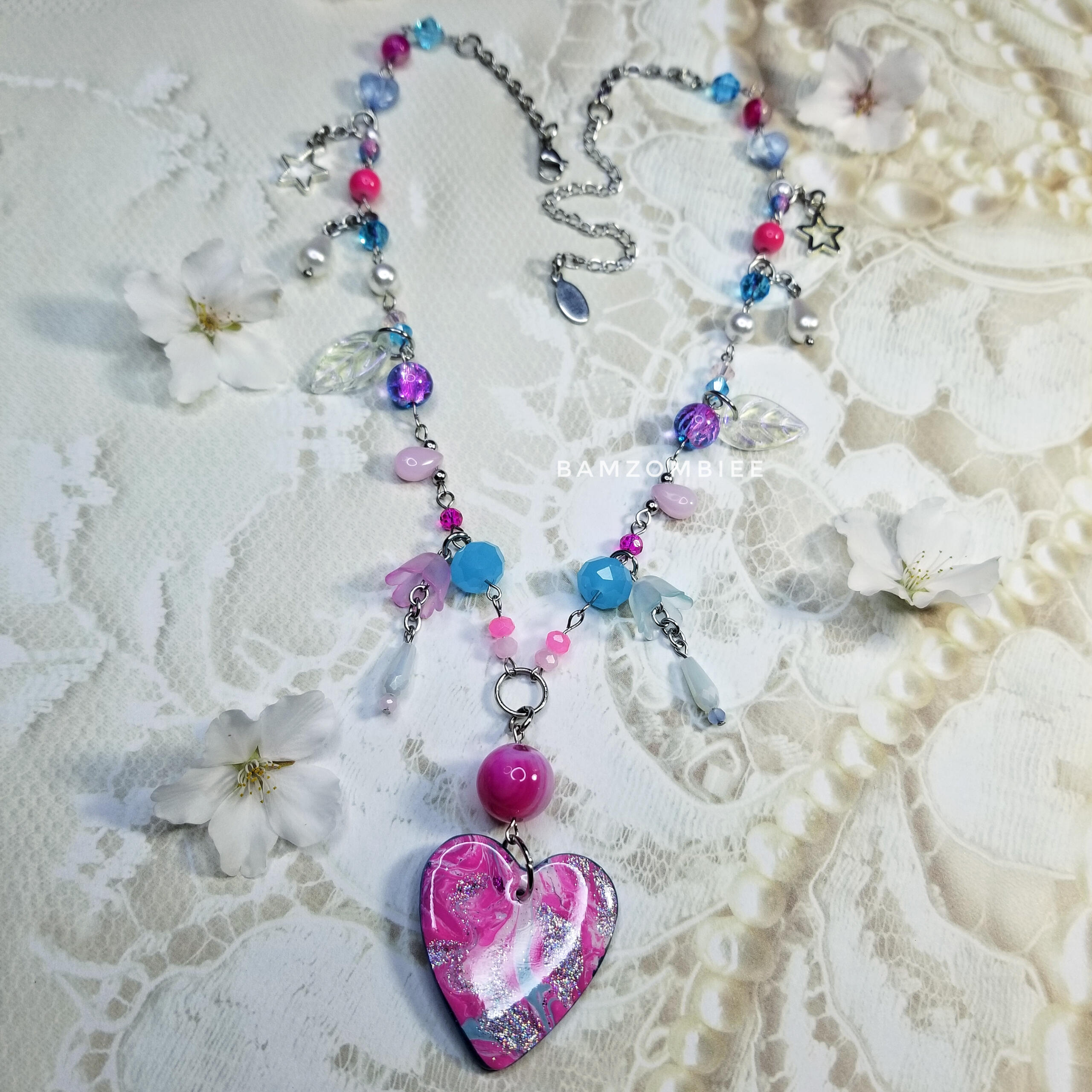 this necklace features a handcrafted opalescent charm, accompanied by pastel pink & mint beads, and plenty of dangly details.