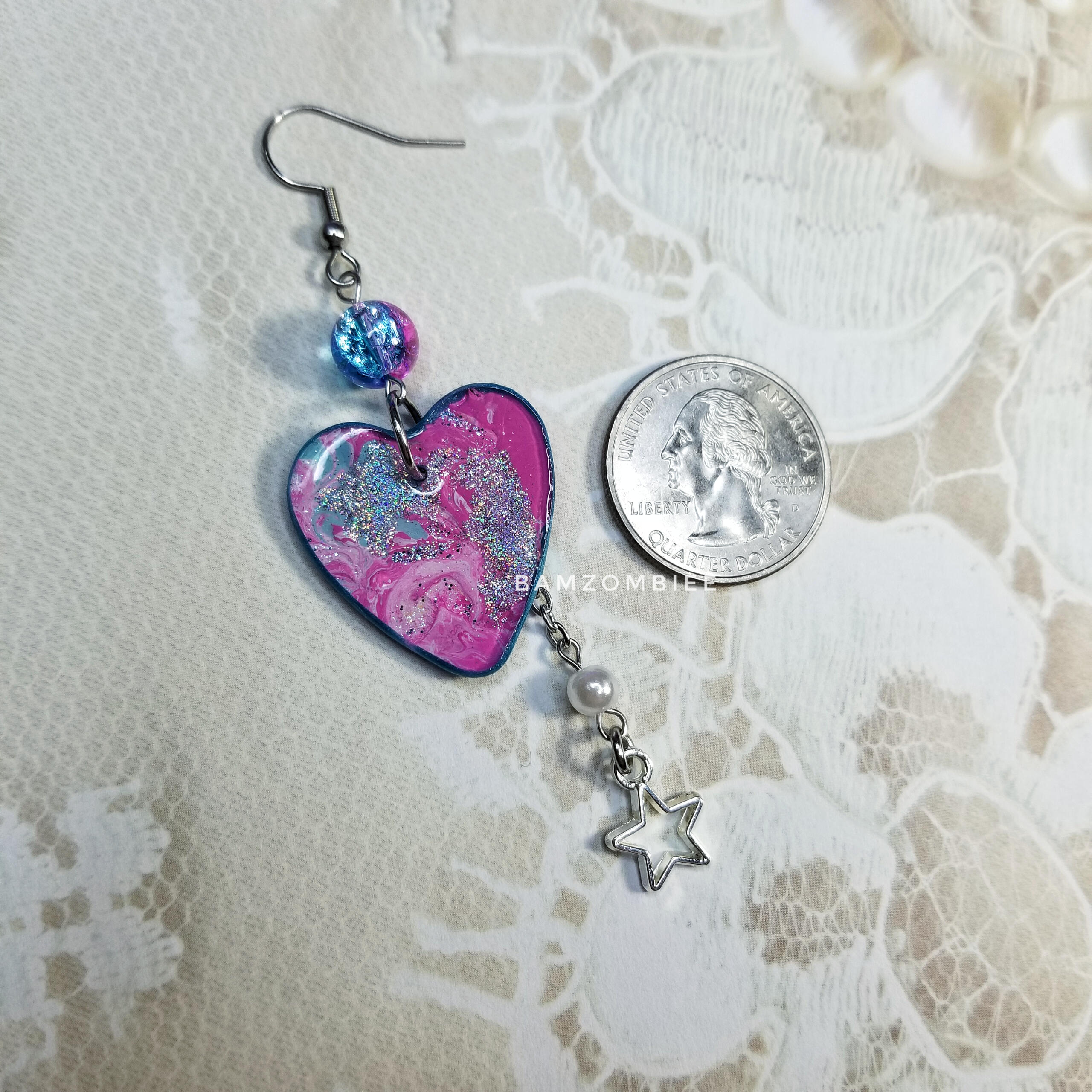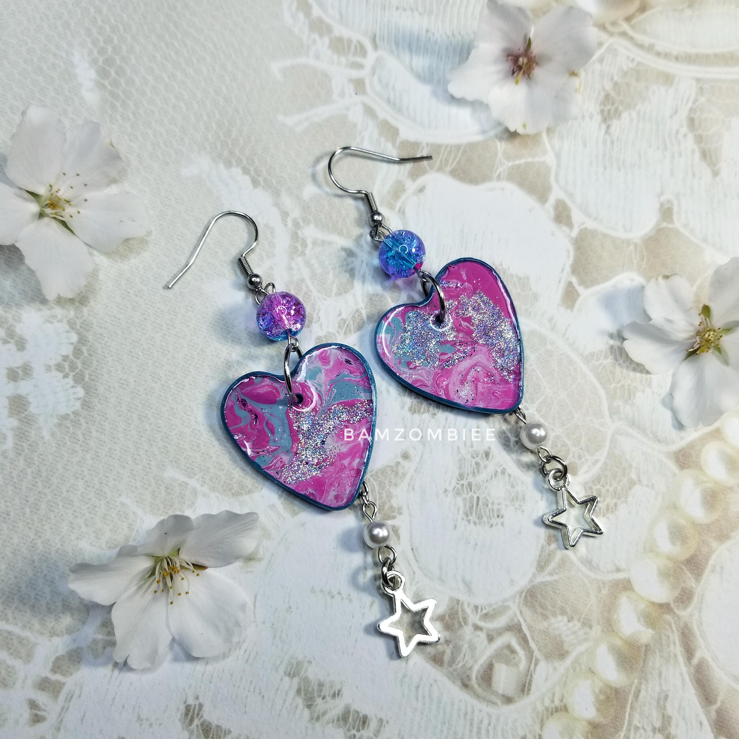 x1 in stock & ready to ship; quantities past that will be made to orderthese earrings feature one of my original designs, printed on shrinky plastic, and coated with glitter & resin. they are accented with matching star beads & charms.