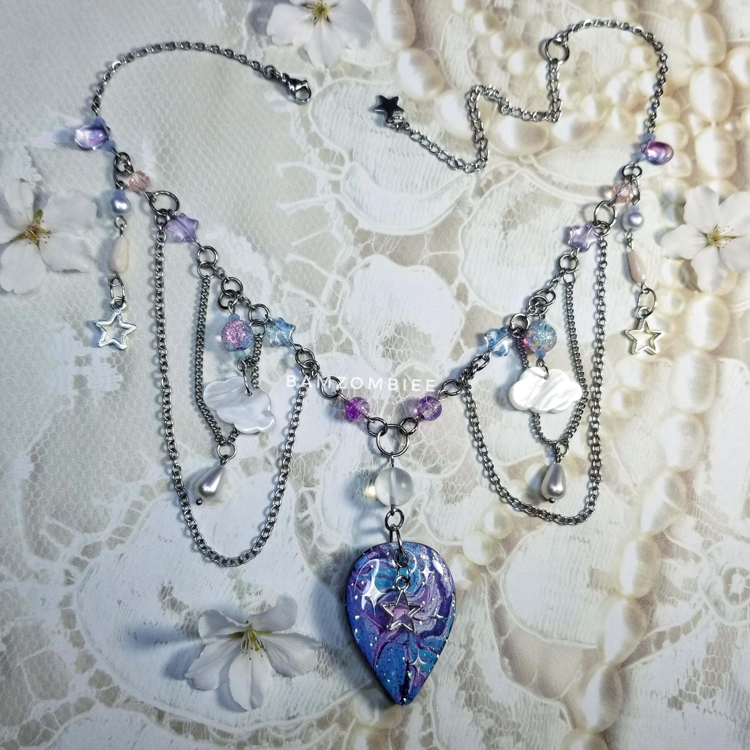this necklace features a handcrafted charm with a swirly blue & purple design. it is accompanied by dangly chains, clouds, star charms, and matching beads.