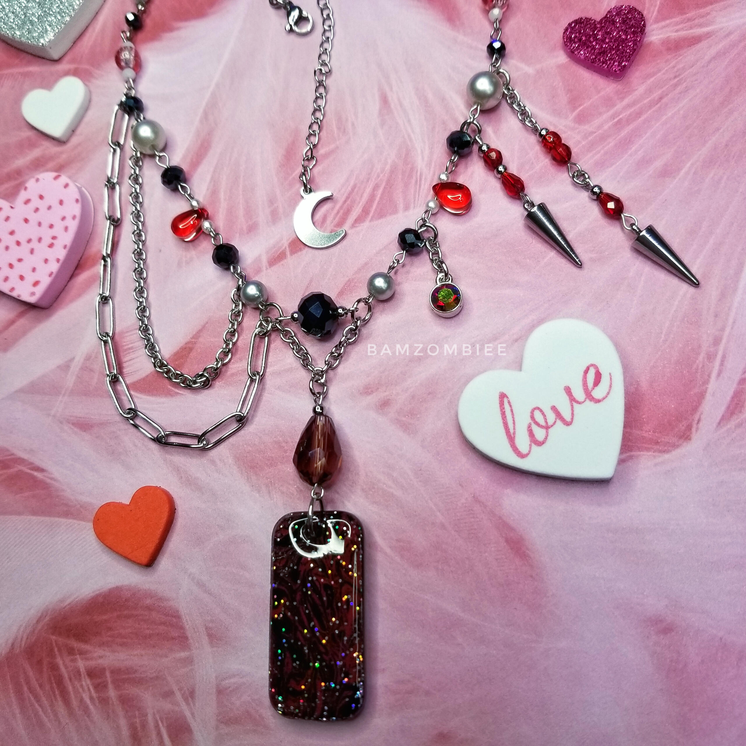 this necklace features a handcrafted charm with marbled paint on the front, and black glitter on the backside. the design is asymmetrical, detailed with dangly chains, red & black beads, and spiky "vampire teeth" charms.