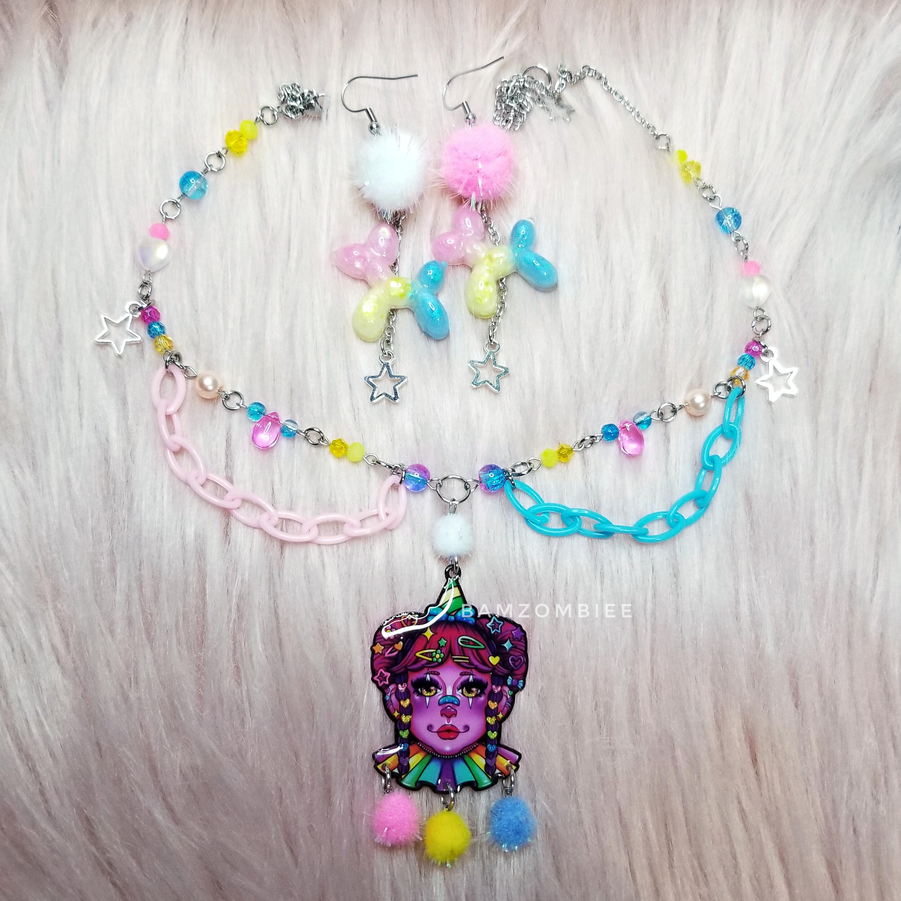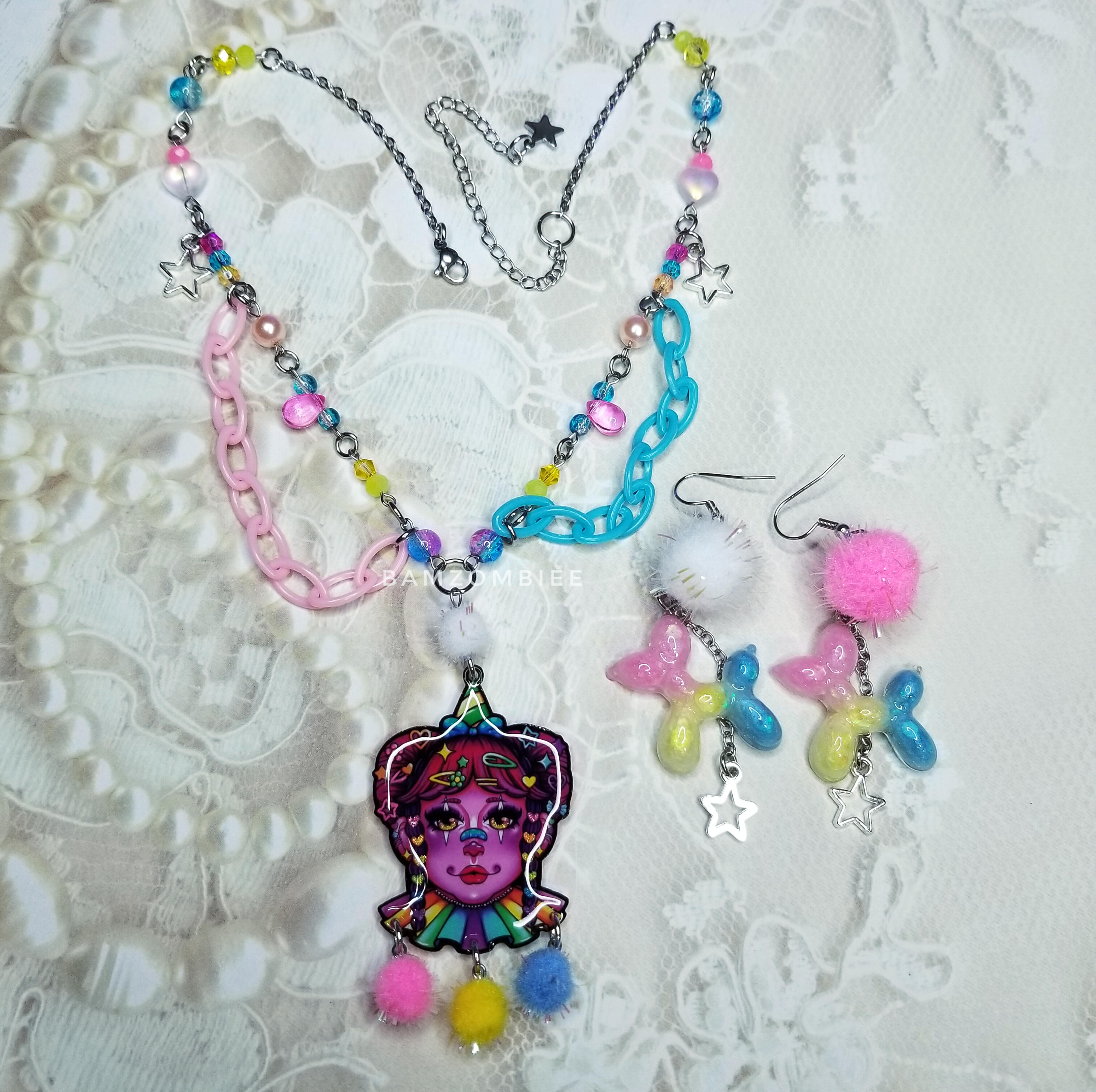 this circus set comes with a clown necklace and balloon dog earrings. the set features a fun pink, blue, and yellow color scheme.SIZING: necklace is adjustable from 16" - 19.5". earrings measure approx 8 cm long.