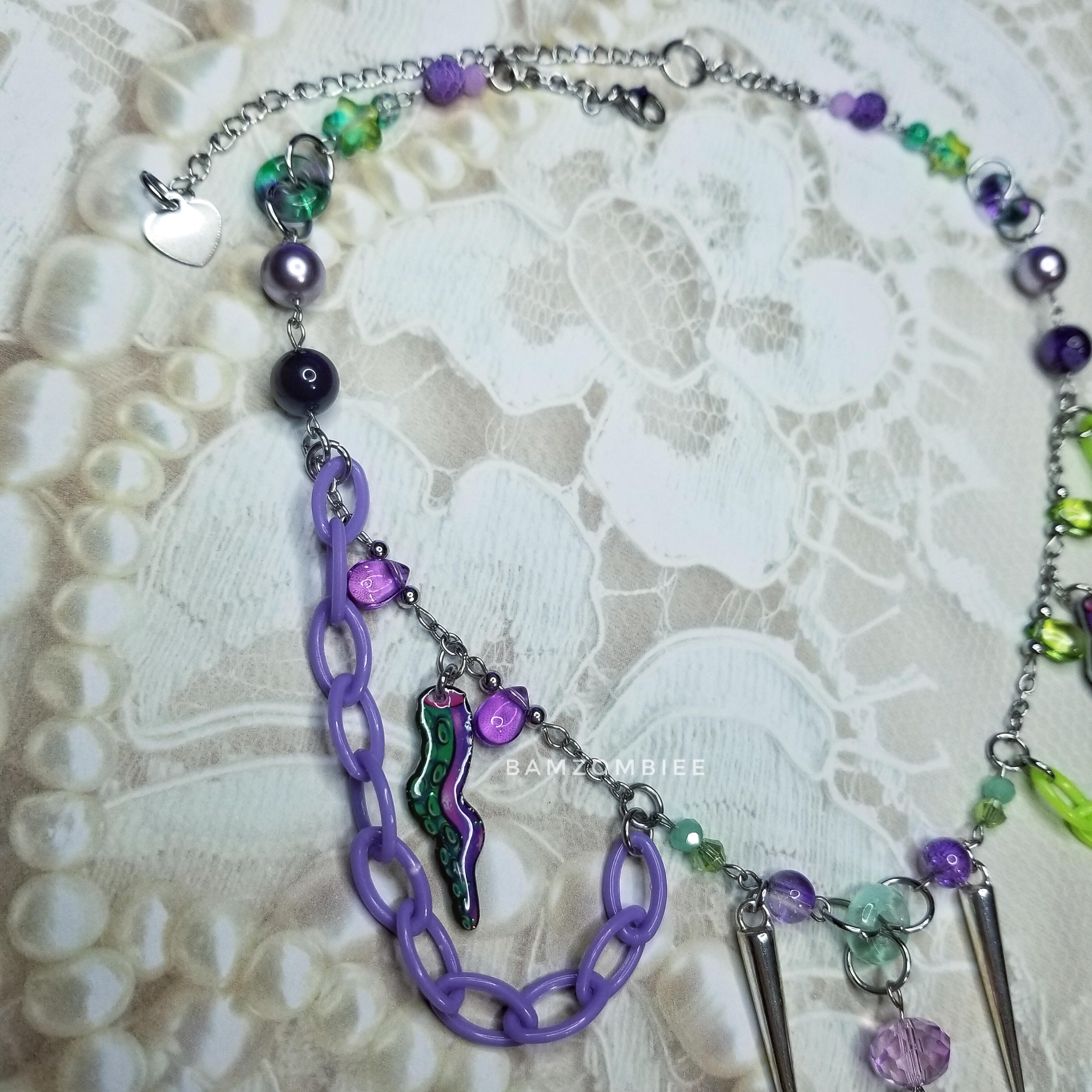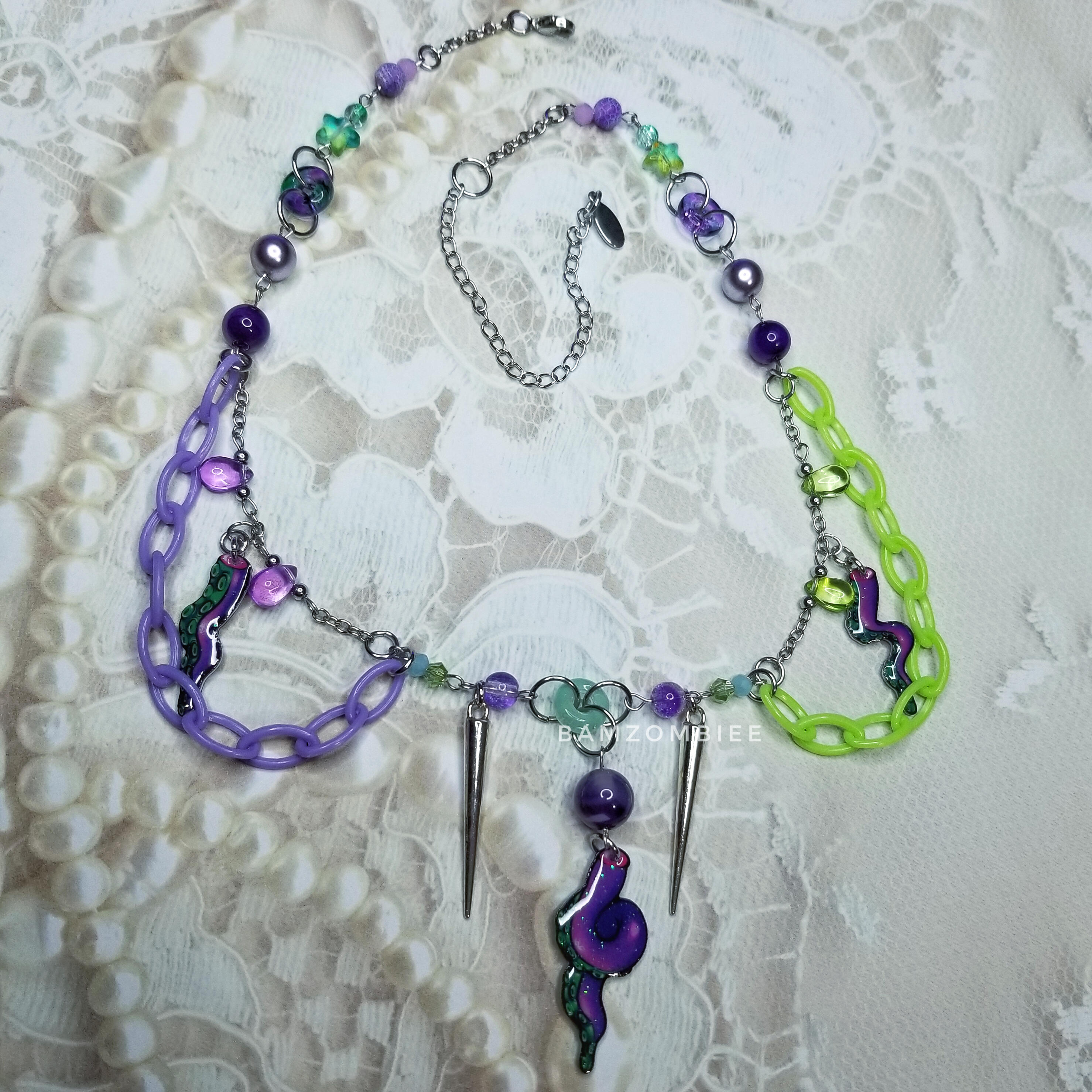 this necklace features my original tentacle drawings on resin-coated shrink plastic. it has 3 dangly tentacle charms and matching green&purple beads. tentacle style and placement may vary between pieces.