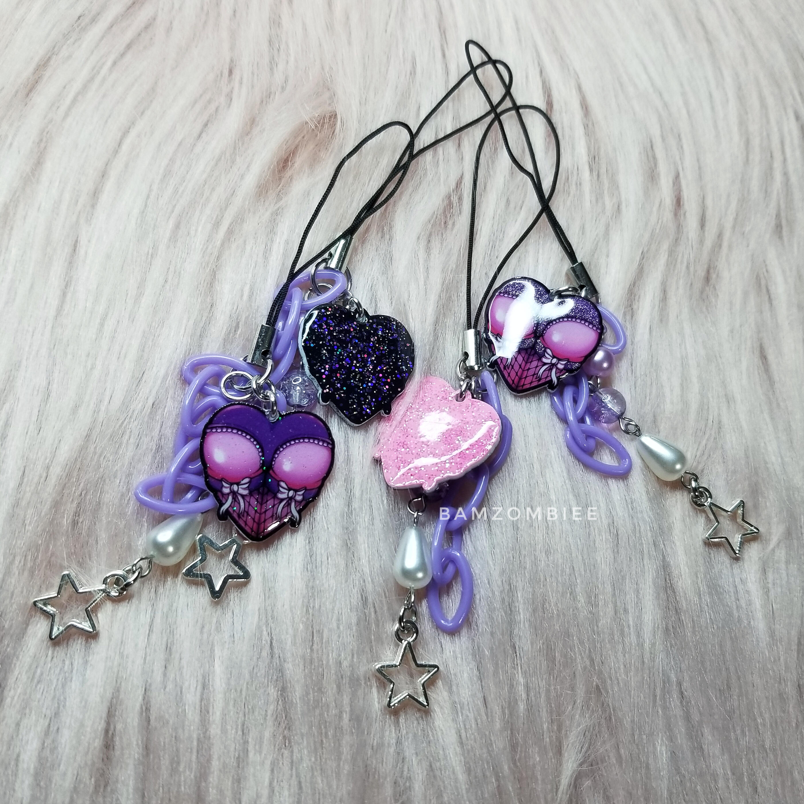 MATERIALS: the charms are made from shrink plastic and UV resin & all of the metals are stainless steel, with pom poms, and glass & plastic beads/chains for decoration.