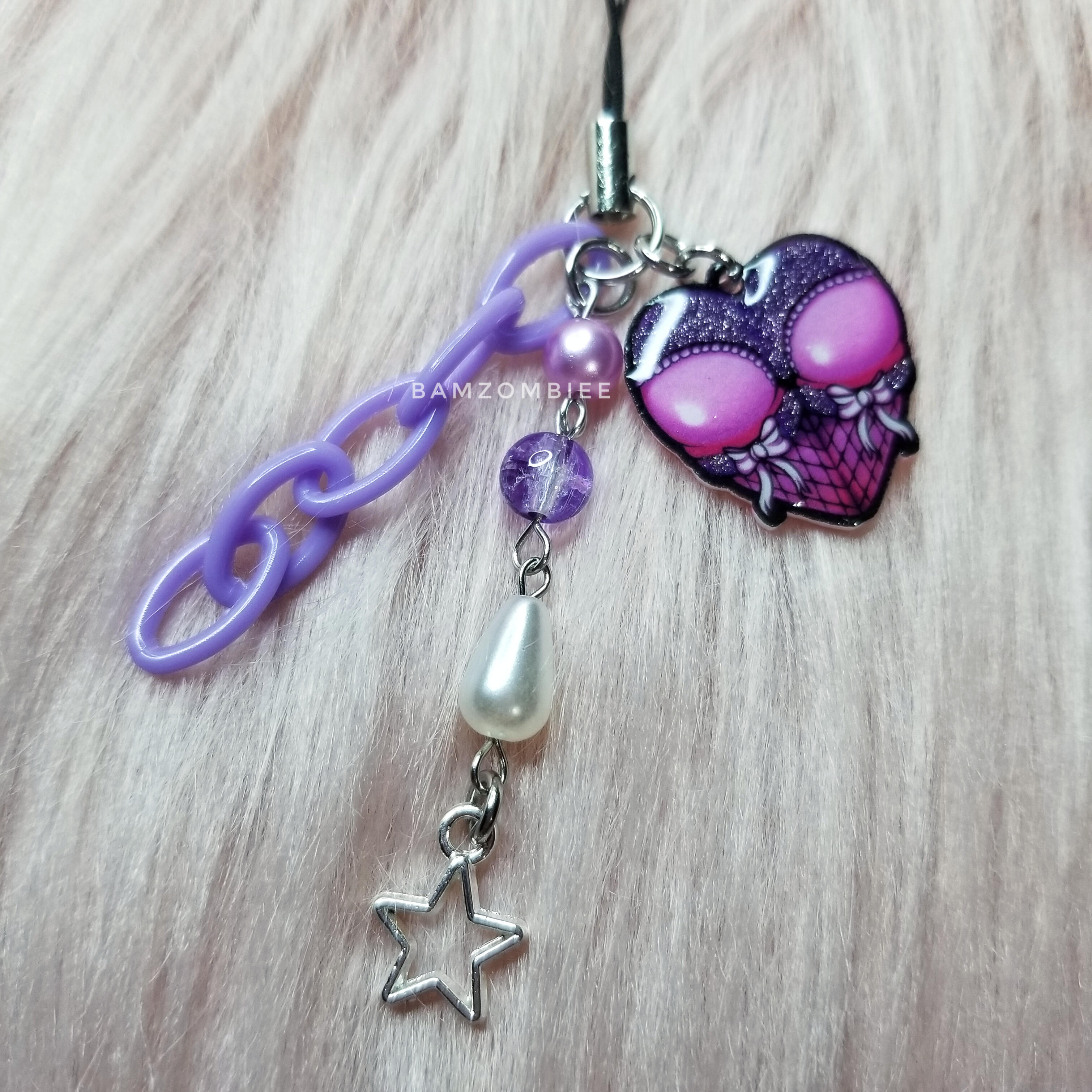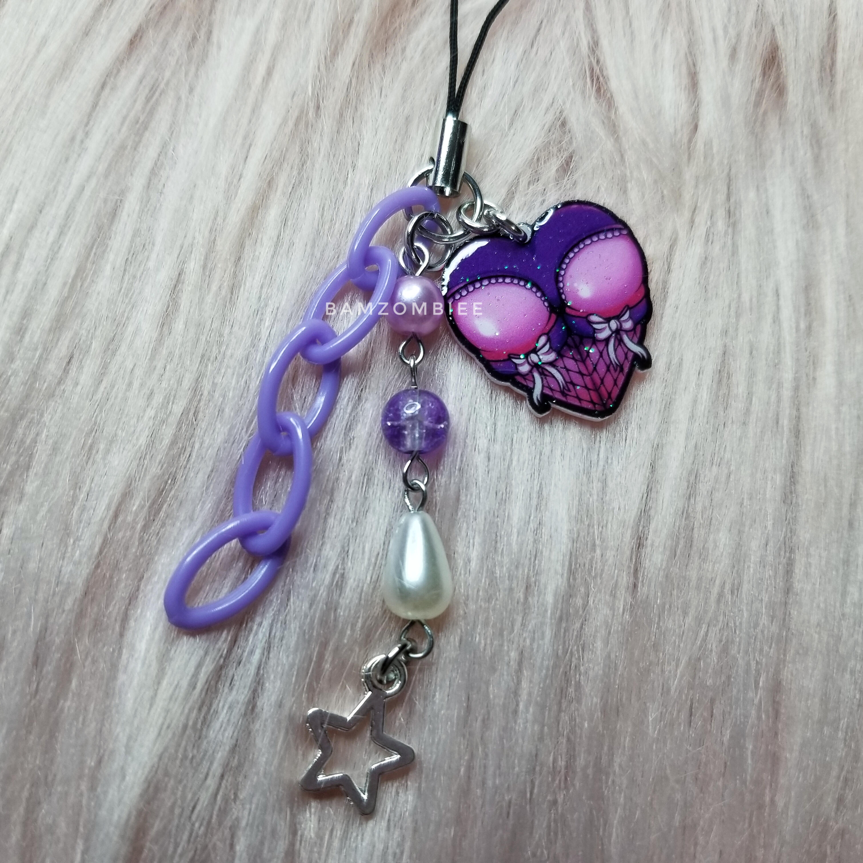 this phone charm features my original artwork printed on shrink plastic and coated with glitter and resin. it has colorful bead and chain accents. color of the backside may either be pink or black.